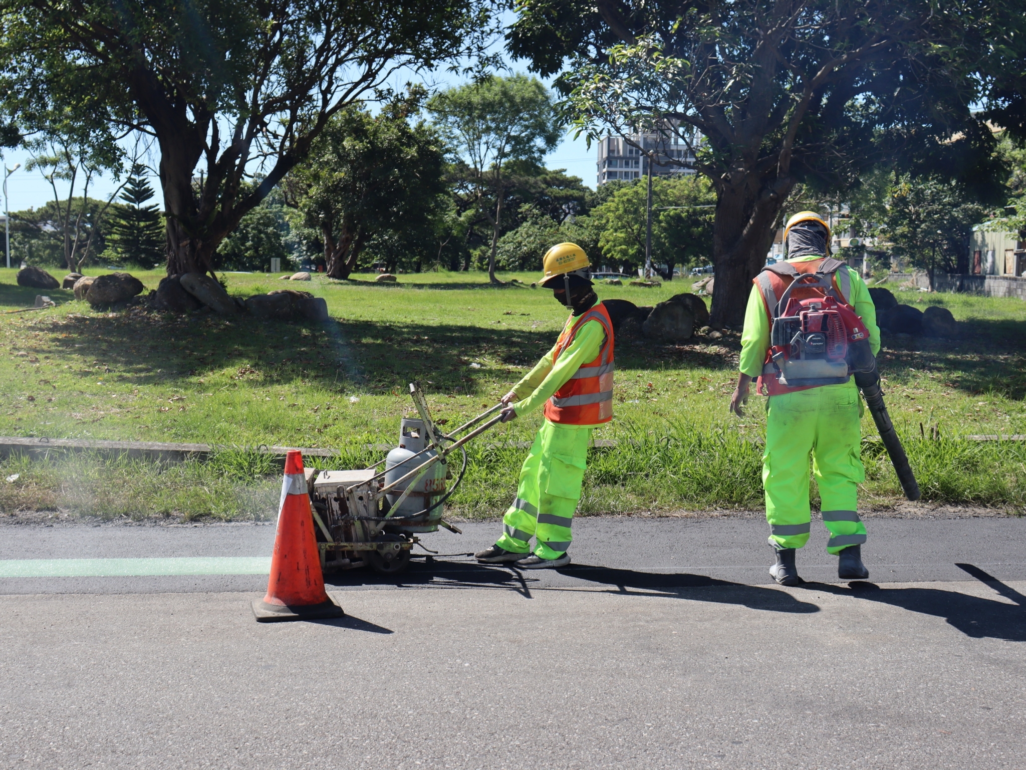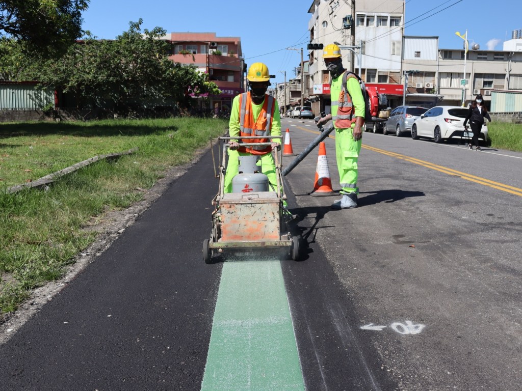 花蓮市公所今天在中美九街執行標線型人行道劃設工程,該項目採用防滑係數達65BPN的標準,希望增加用路人安全及友善空間。當地由於未設置人行道,加上周邊有美崙國中及鑄強國小等校區,考量通學安全,花蓮市公所優先納入今年度的道路標線工程施作。