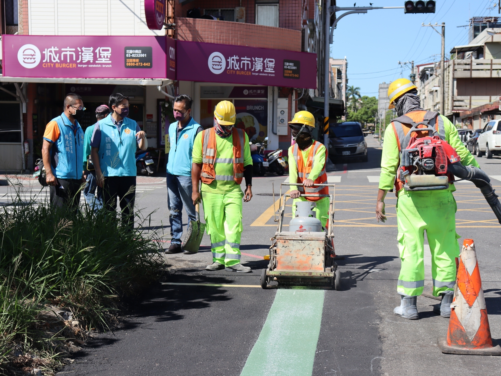 魏嘉賢市長13日上午偕同建設課長徐國城到中美九街視察標線劃設工程,並慰勞辛苦的工作人員。民政里長林志鵬也到場表達關切,並感謝魏市長得知當地有交通環境的問題時,相當接地氣的讓市民非常有感。這項工程由花蓮市道路標誌(字)標線劃設工程開口契約威勝交通工程有限公司執行,施作地點位在中興路至化道路之間的中美九街,長度約155公尺。