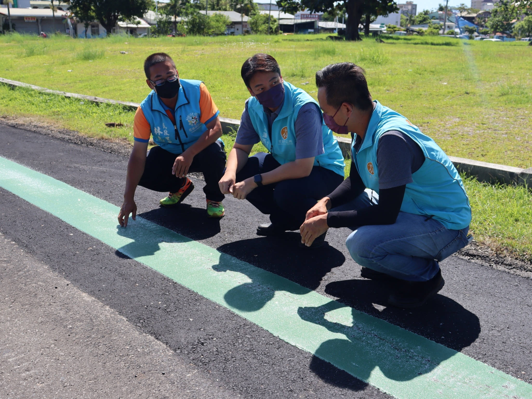 對於中美九街為何不規劃實體人行道,徐國城課長也說明原因。他指出,道路兩側均為台肥土地,沒有多餘的土地可以施作實體人行道,即便施做了,將會縮減原有車道,反而會造成交通不良的影響,因此經與林里長討論後,決定利用部分路面規劃設置標線型人行道,可以兼顧現有交通以及用路人通行的安全。至於人行道劃設的塗料裡加入具止滑效果的金鋼砂,防滑係數高達65BPN標準,避免雨天有滑跤跌倒的機率發生,其他若有需要增設防護安全裝備,均會視地方需求性來逐一改善。