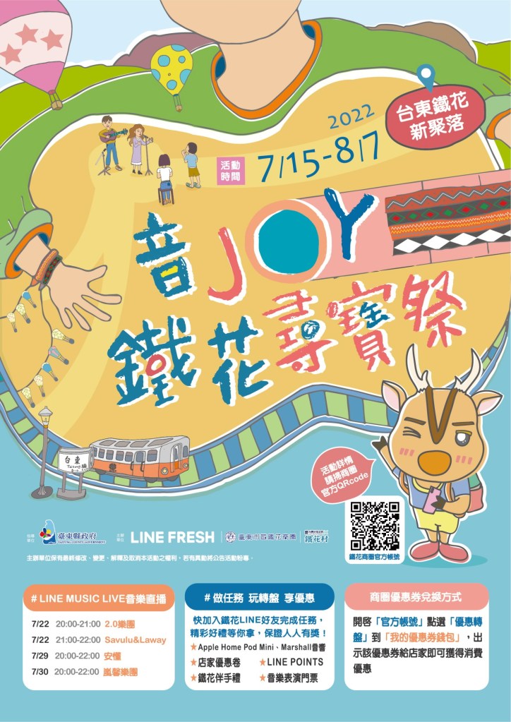 因疫情影響不少產業受到衝擊,為了加速地方數位轉型服務,今年夏天,在台東縣政府支持下,由LINE FRESH集結台東市區鐵花商圈發展協會、台灣好基金會x鐵花村音樂聚落‧慢市集,自7月15日至8月7日在鐵花音樂新聚落一起推動「音JOY鐵花尋寶祭」,並於15日下午2點在鐵花村舉行啟動記者會,希望透過新世代的創意企劃落地,將在地音樂文化、特色元素與店家資源作整合並導入數位應用,為台東鐵花新聚落注入新玩法。