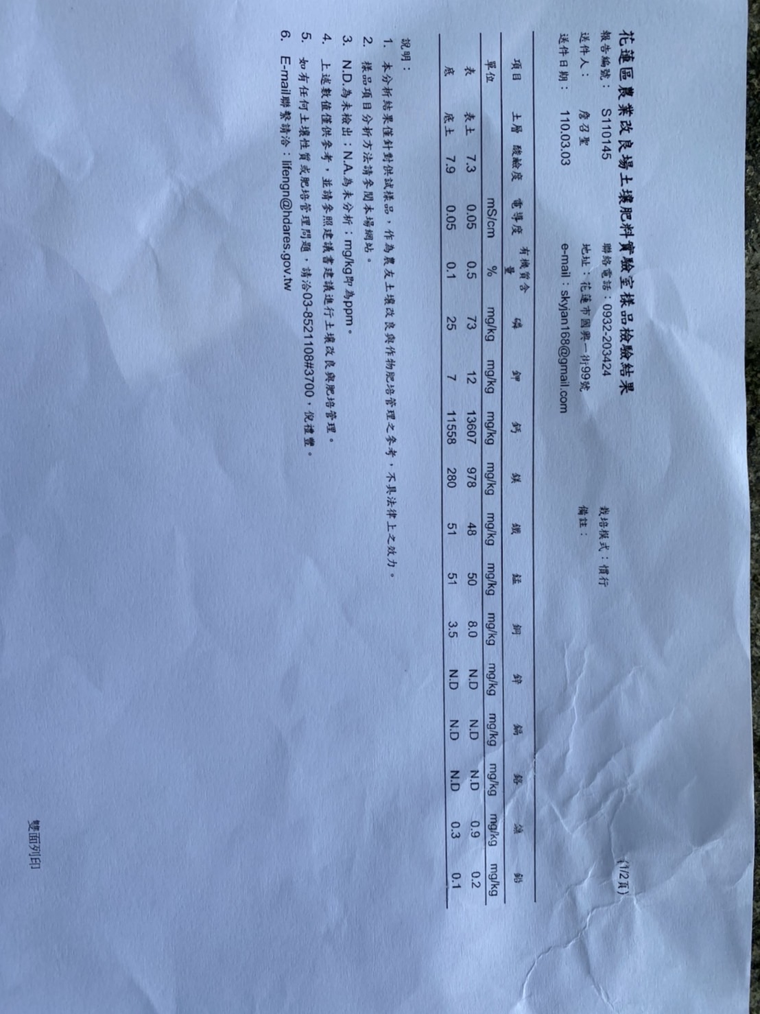 7/14會勘,詹姓農民當場拿出一張110年03月03日的土壤檢測報告單,沒有官防和背書單位的印章,也沒有述明地段地號,從這裡不難發現原來偷埋事件可能早在110年的3月即已經開始,環保局並當場表示詹姓農民在現場回復之前,已取樣檢測通過,但議員質疑埋填液體的取樣過程和檢測結果報告在哪裡?詹姓農民竟然欲蓋彌彰,拿110年3月3日送花蓮農改場的土壤改良建議,來舉證他的土地需要改良,這與整體偷埋事件根本是毫無關聯。