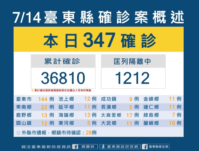 記者 姜嘉瑋/臺東報導 台東縣今(14)日新增347位確診者,319名民眾戶籍或居住地分在台東、28名為外縣市 … 繼續閱讀 台東今日新增347 衛生局提醒密切接觸者應落實居家隔離期間相關防疫規範
