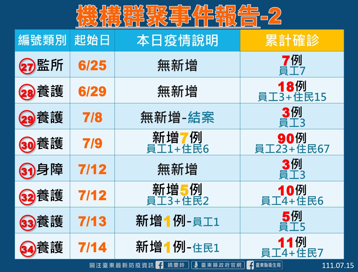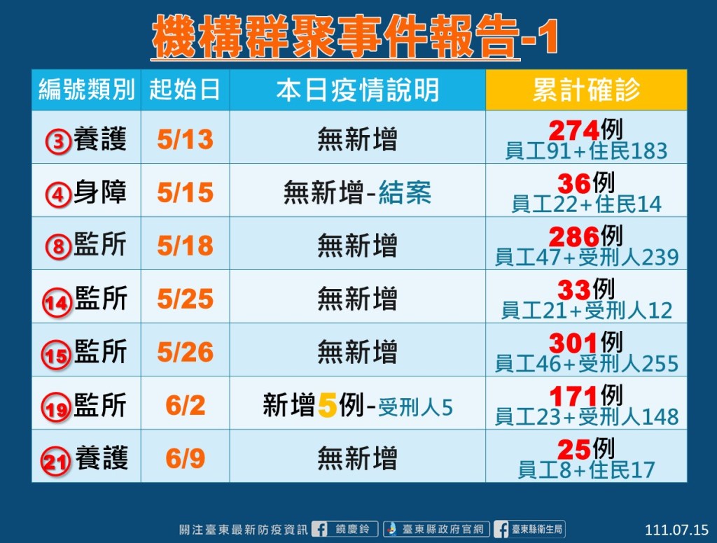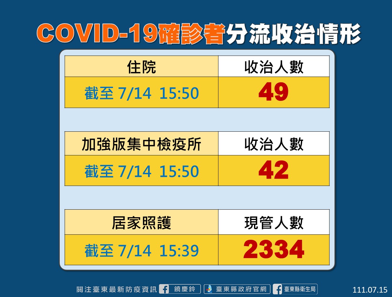 台東縣今(15)日新增327位確診者,304名民眾戶籍或居住地分在台東、23名為外縣市醫院通報。目前台東縣累計確診個案37138人、居隔者1186人。目前台東針對COVID-19確診者分流收治情況,截至7/14下午16點為止,住院收治人數為49、加強版集中檢疫所為42人、居家照護現管人數有2334人。 台東縣衛生局表示,今日1養護、1身障機構監測期滿結案,總計縣內尚有7養護、5監所、1身障機構群聚事件持續監控中,本日共新增19例確診個案。養護機構部分,新增14人確診(9住民、5員工);監所新增5收容人;身障機構無新增。群聚監測中機構仍將暫停探訪探視避免擴大,衛生局將持續安排定期採檢匡列,並協助機構落實感染管制措施。
