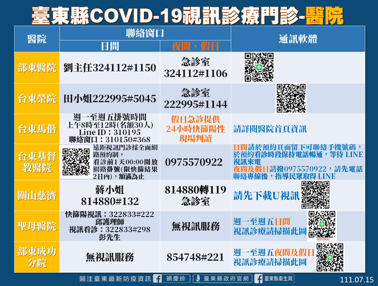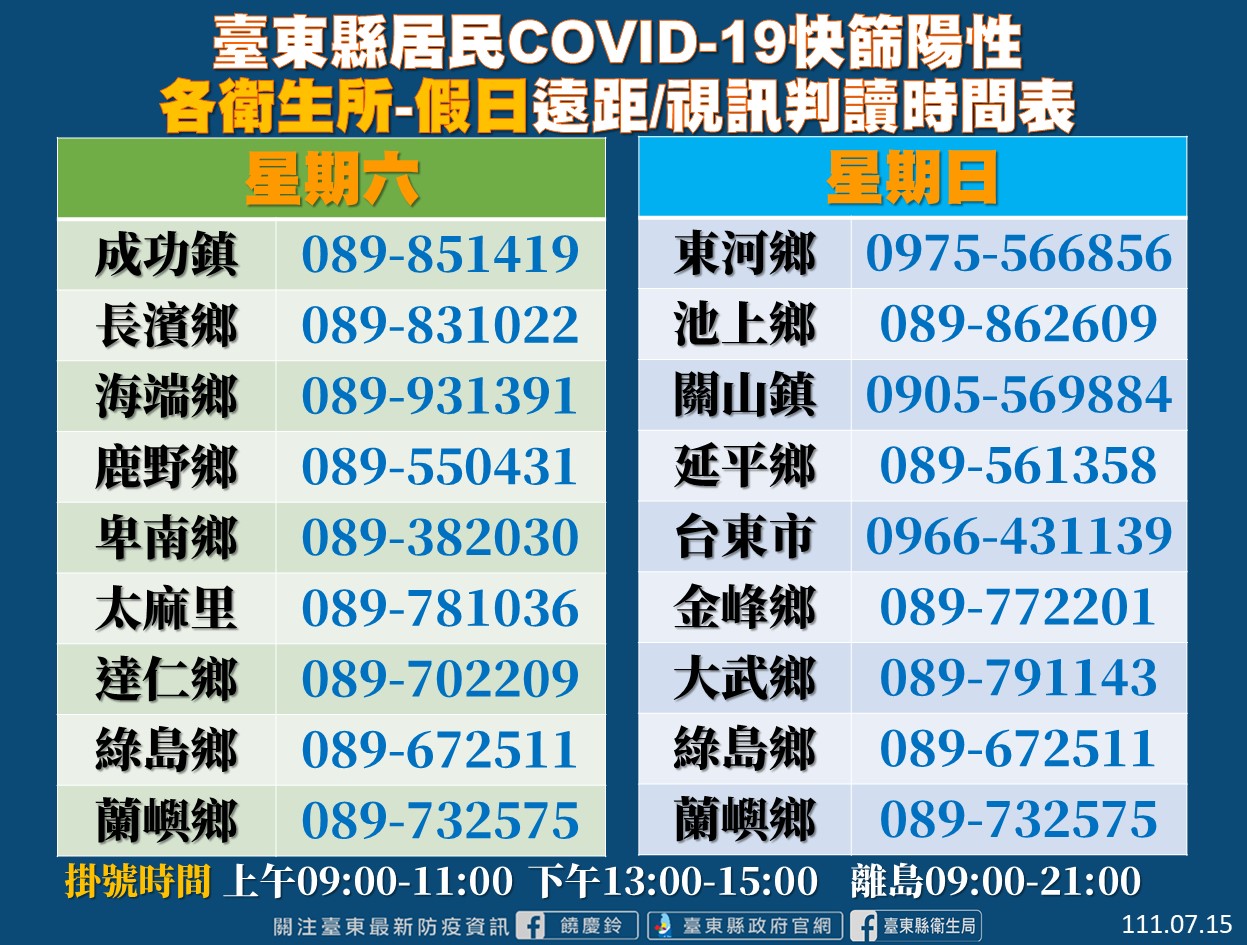 衛生局說明,除縣內醫療院所外,各地區衛生所針對快篩陽性民眾也提供假日遠距視訊判讀,掛號時間為上午九點至十一點,下午一點到三點;離島地區則是上午九點至晚上九點,提供鄉親假日服務,若有就醫需要,也可透過視訊看診或請親友代為領藥,相關訊息也請隨時注意台東衛生局粉絲專頁。各院所服務時間,其中,綠島及蘭嶼兩離島7月16、17日兩天均提供服務,另7/16(六)全天服務有成功、長濱、鹿野、海端、卑南、太麻里、達仁等衛生所。7/17(日)全天服務則有東河、池上、關山、延平、台東市、金峰、大武等衛生所。