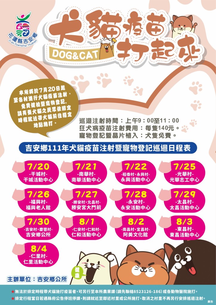 吉安鄉公所「111年度犬貓疫苗注射暨寵物登記巡迴日程」將於7月份起分別如下日期、地點辦理,7月20日干城活動中心、21日南華活動中心、22日永興活動中心、25日光華志工中心(光華三街207號)、26日福興老人館、27日勝安宮大門前、28日永安活動中心、29日太昌活動中心、30日吉安鄉公所、8月1日仁和活動中心、2日阿美族文物館、3日東昌活動中心、4日仁里活動中心,歡迎民眾於當日早上9時至11時,踴躍帶領毛小孩前往施打。