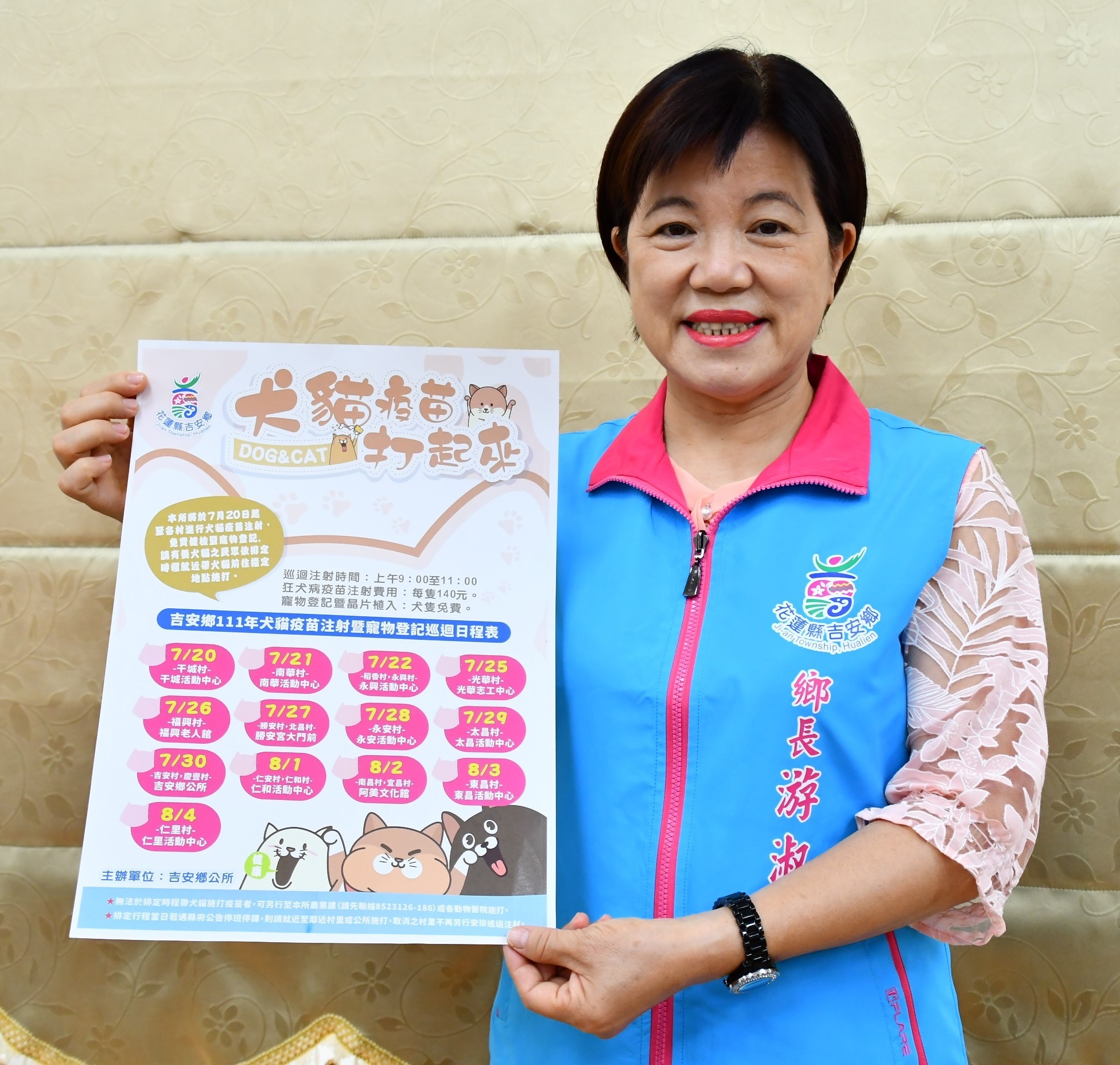 毛爸毛媽注意囉!吉安鄉公所「111年度犬貓疫苗注射暨寵物登記巡迴日程」共計13場次於7月20日起正式開跑,敬請今年度尚未替家中毛寶貝注射狂犬病疫苗或從未進行寵物登記的飼主,踴躍參與巡迴活動。鄉長游淑貞表示,毛孩寵物不僅是陪伴主人的家人、朋友,同時也是家中重要的一份子,因此守護牠的健康非常重要,完成寵物登記、每年施打狂犬病疫苗以及定期寵物健檢都可以在巡迴中一次到位辦理,歡迎鄉親多加利用。