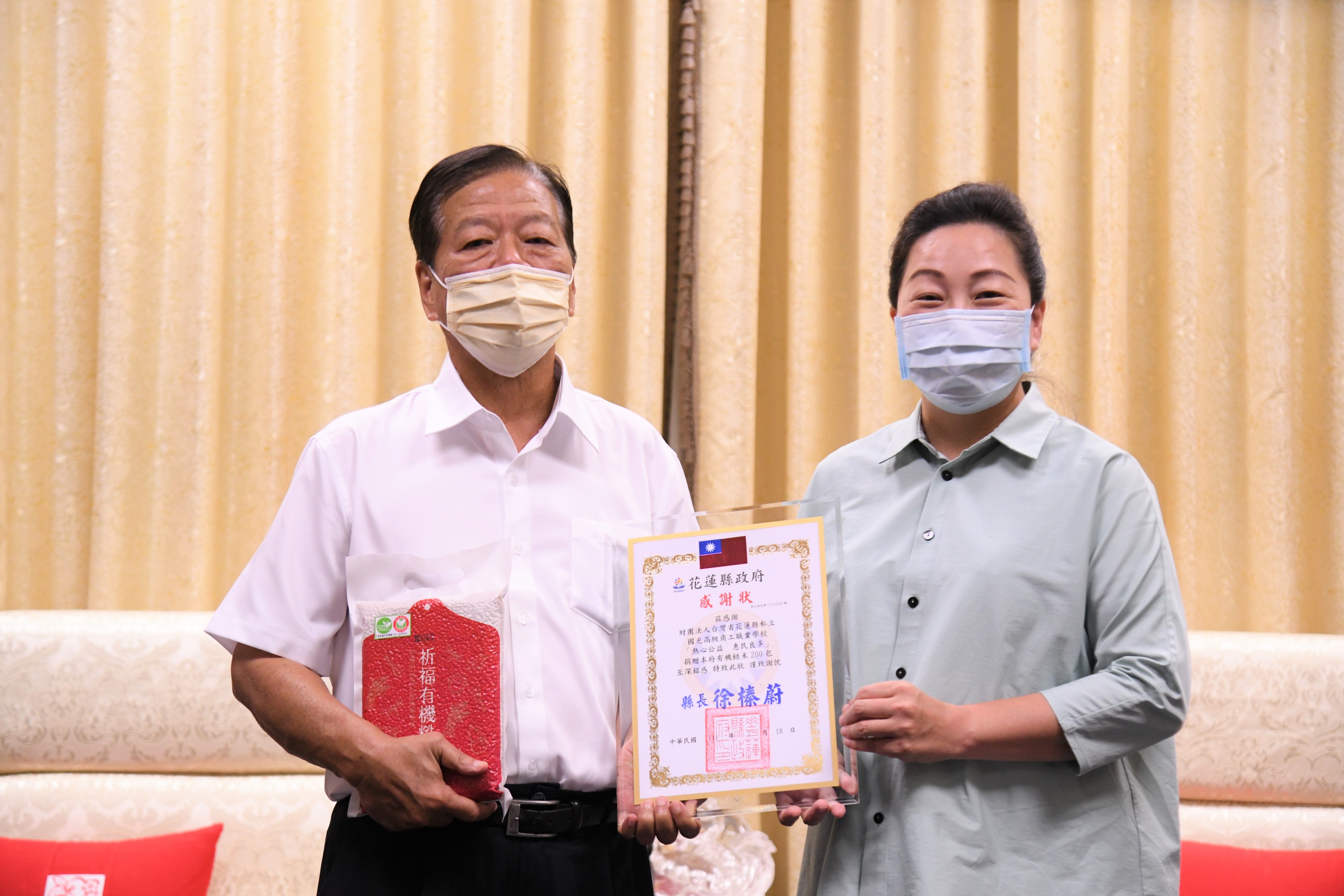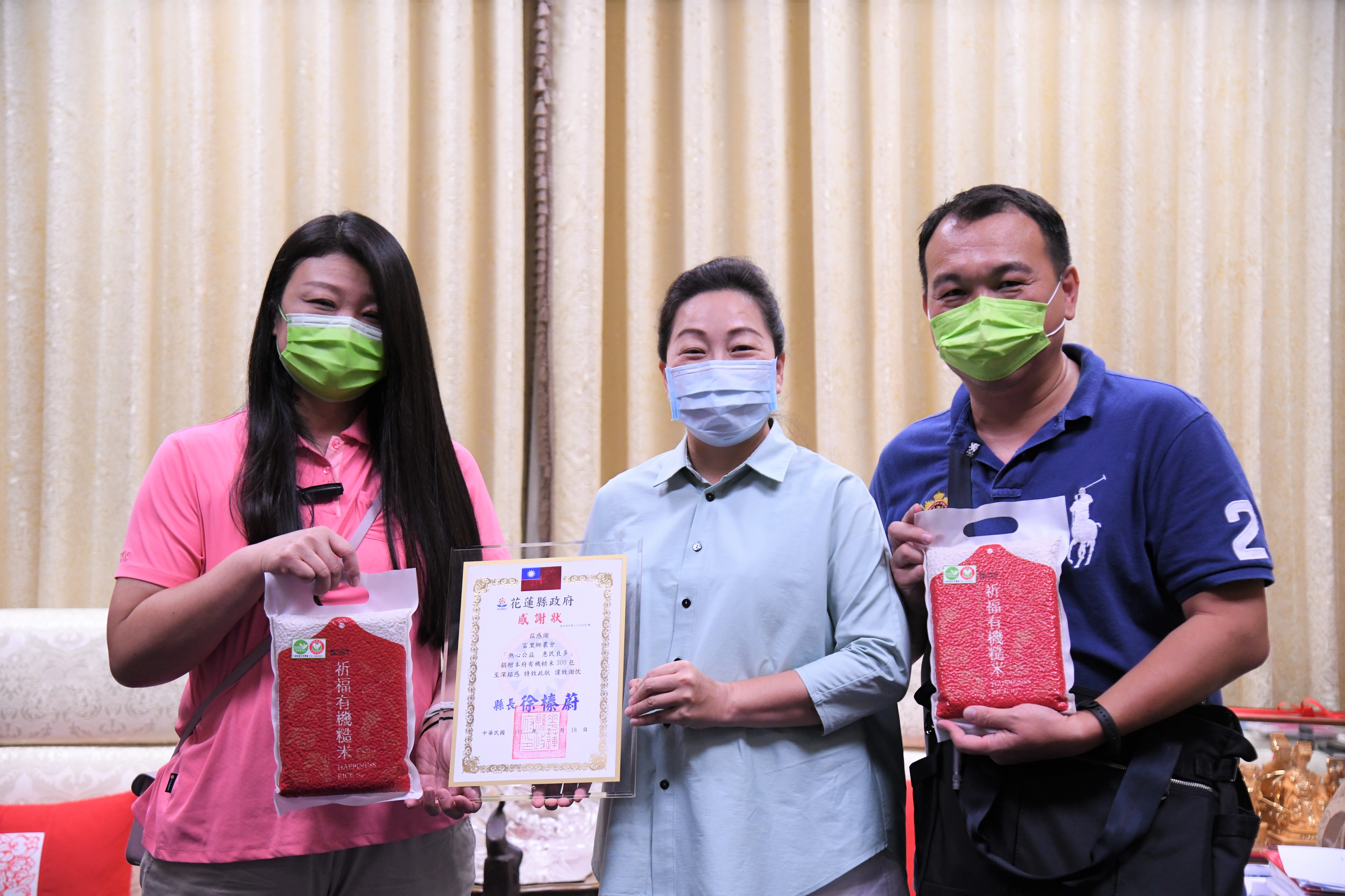 花蓮富里鄉農會、花蓮縣波斯頓國際實驗教育機構、國光高級商工今(18)日捐贈1200包有機糙米,縣長徐榛蔚在行研處長吳昆儒陪同下代表受贈,希望透過縣府將認養的1200包1公斤有機糙米捐贈給花蓮縣防疫人員,讓社會有正能量挹注。