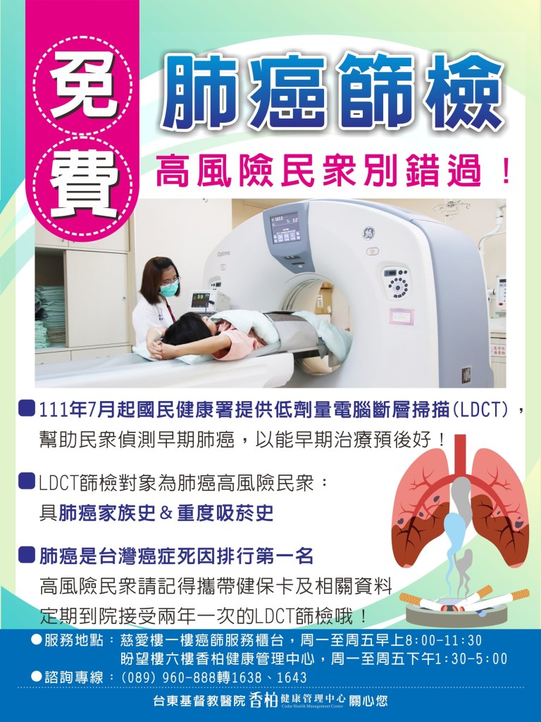 衛生福利部自7月1日起開辦肺癌早期偵測計畫,提供肺癌高風險族群2年1次低劑量電腦斷層檢查(LDCT),台東縣衛生局表示,台灣是世界第一個針對具肺癌家族史及重度吸菸者提供肺癌篩檢的國家,呼籲肺癌高風險族群,歡迎向台東基督教醫院預約免費肺癌篩檢,縣長饒慶鈴提醒鄉親肺癌篩檢不能預防肺癌發生,吸菸仍是肺癌最主要的危險因子,有吸菸之民眾,應接受戒菸服務,找回自身的健康,平日應注意肺部的健康狀況及做好定期篩檢。 台東縣衛生局表示,癌症連續數十年排行死亡原因之首,而肺癌更是癌症死亡原因的第一名,女性罹患肺腺癌比率也有上升趨勢,根據衛福部2015-2019年癌症發生率統計,台東縣肺癌診斷為第三、四期的個案占7-8成,也是癌症死因第一位。自7月1日起,癌症篩檢又多了一項新的肺癌免費篩檢政策,凡是符合下列任一肺癌高風險族群對象:1.具肺癌家族史:50至74歲男性或45至74歲女性,且其父母、子女或兄弟姊妹經診斷為肺癌之民眾;2.重度吸菸史:50至74歲吸菸史達30包-年以上,有意願戒菸或戒菸15年內之重度吸菸者,請洽詢台東基督教醫院預約檢查。 肺癌個案的死亡率高,存活率低,主要與診斷的期別有關,所以早期診斷早期治療有其重要性和必要性,LDCT(低劑量電腦斷層掃描)是目前唯一具國際實證,可以早期發現肺癌的篩檢工具,能降低重度吸菸者20%肺癌死亡率。 除了具肺癌家族史或重度吸菸者應定期接受肺癌篩檢外,吸菸者更應該要戒菸,重度吸菸者為肺癌高危險群之一,且男性居多,又因女性肺癌個案大多數不吸菸,為強化女性非吸菸者肺癌篩檢政策,經過多次的專家會議討論後,特別將女性具肺癌家族史的篩檢年齡提前到45歲,讓更多具肺癌風險因子的女性,能夠接受肺癌篩檢服務,LDCT可協助早期診斷肺癌,降低肺癌死亡率。 衛生局指出,台東縣有別於其他縣市,除提供7項免費癌症篩檢,在原有的子宮頸癌、乳癌、大腸癌及口腔癌篩檢外,台東縣政府更積極爭取經費先驅實施胃癌防治及肝癌防治篩檢,並且全台首創,將乳癌篩檢年齡提前從40歲開始,成效卓著,自7月1日起又新增免費肺癌篩檢,台東縣衛生局呼籲符合篩檢資格之民眾,踴躍洽詢鄉鎮衛生所報名各項癌症篩檢服務,肺癌篩檢則由台東基督教醫院提供服務,請踴躍篩檢,早期診斷,早期治療。