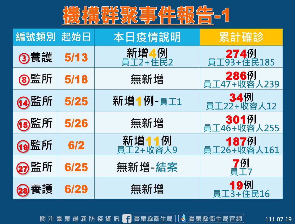 台東縣衛生局表示,今日1矯正機關監測期滿結案,總計縣內仍有7養護、4監所、1身障機構群聚事件持續監控,今日共新增31例確診個案。養護機構部分,新增19人確診(15住民、4員工);監所新增12人(9收容人、3員工);身障機構無新增。群聚監測中之機構仍將暫停探訪探視避免擴大,衛生局將持續安排定期採檢匡列,並協助機構落實感染管制措施。