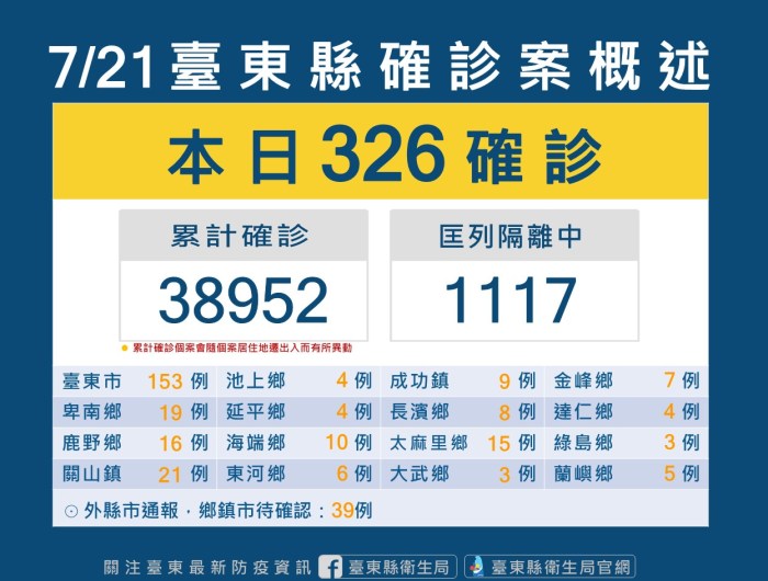 城鄉新聞 記者 姜嘉瑋/臺東報導 台東縣今(21)日新增326位確診者,287名民眾戶籍或居住地分在台東、39 … 繼續閱讀 台東今新增326位確診案 接種後可降低感染後重症及死亡風險 衛生局籲民眾盡快施打