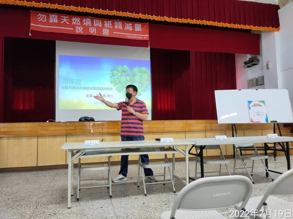 花蓮縣環境保護局日前於玉里鎮中正堂舉辦「勿露天燃燒與紙錢減量宣導說明會」,邀請講師為大漢技術學院土木工程與環境資源管理系許文昌博士,針對勿露天燃燒及紙錢減量相關法規加以宣導,同時邀請玉里鎮公所農業課說明宣導友善耕作、土壤固碳及農藥減半,期望逐漸改變民眾燃燒紙錢的觀念及習慣,進而改善居家環境與寺廟敬拜場所環境品質。