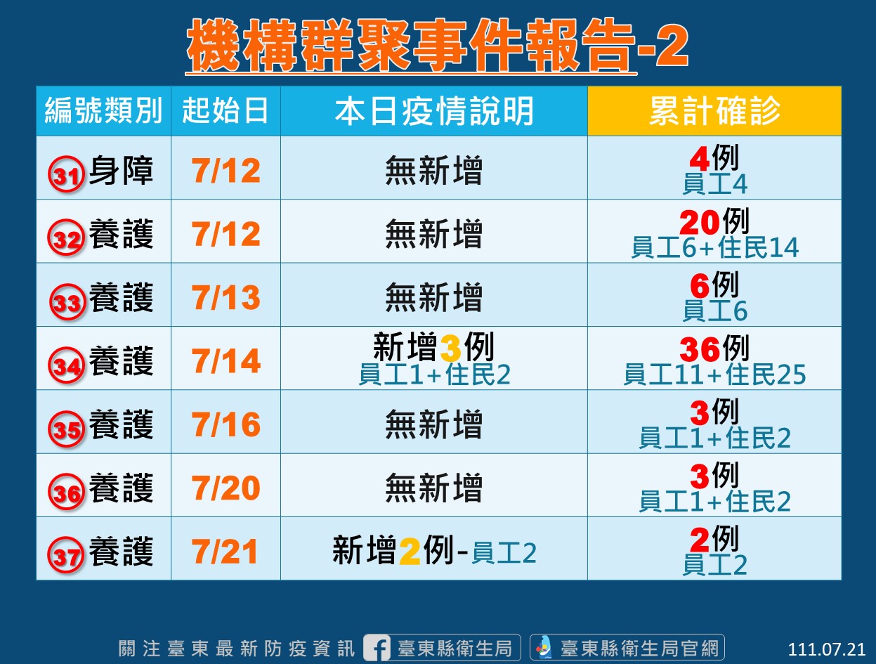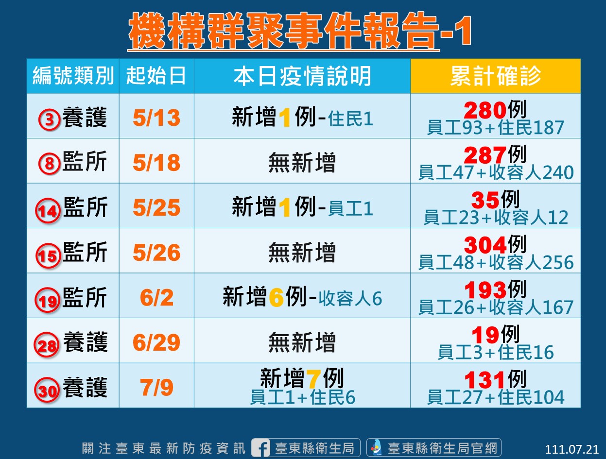 台東縣衛生局表示,今日新增1養護機構群聚案件,總計縣內共有9養護、4監所、1身障機構群聚事件監控中,共新增20例確診個案。養護機構部分,新增13人確診(9住民、4員工);監所新增7人(1員工、6住民);身障機構無新增。群聚監測中機構仍將暫停探訪探視避免擴大,衛生局將持續安排定期採檢匡列,並協助機構落實感染管制措施。