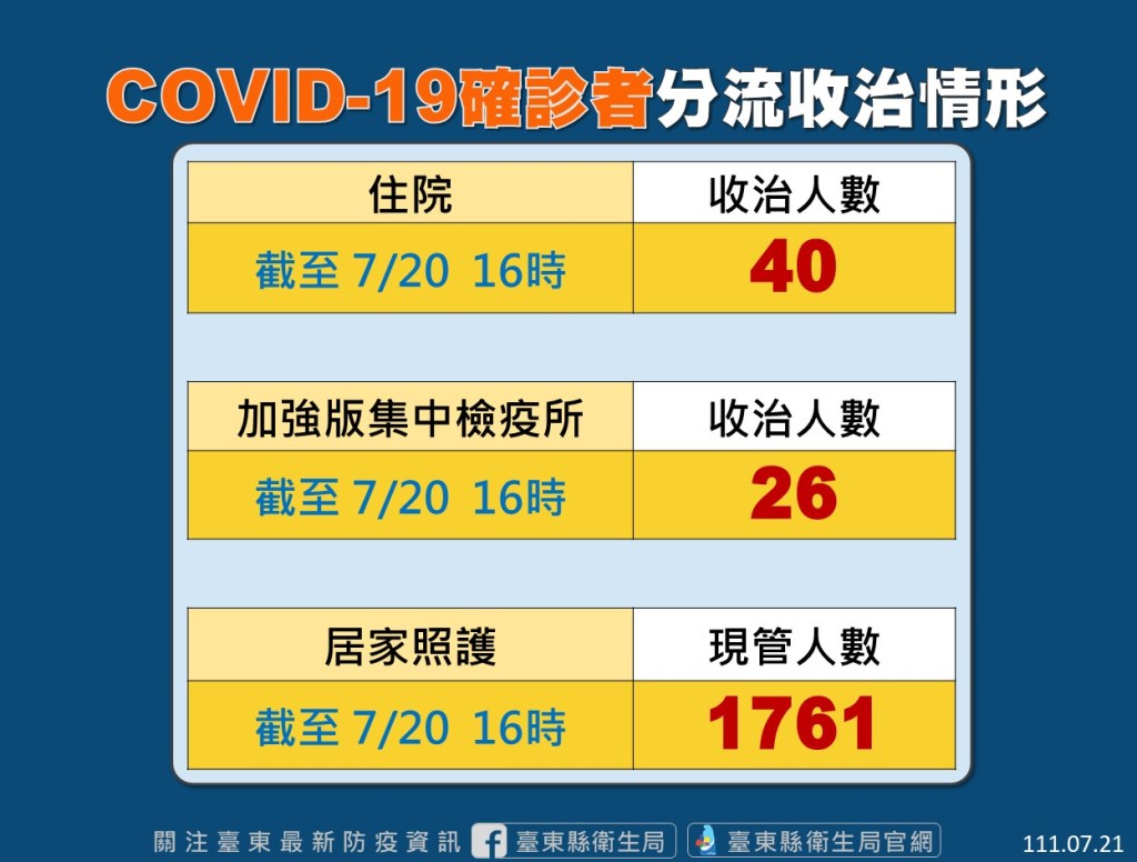 台東縣今(21)日新增326位確診者,287名民眾戶籍或居住地分在台東、39名為外縣市醫院通報。目前台東縣累計確診個案38952人、居隔者1117人。目前台東針對Covid-19確診者分流收治情況,截至7/20下午16點為止,住院收治人數為40、加強版集中檢疫所為26人、居家照護現管人數有1761人。