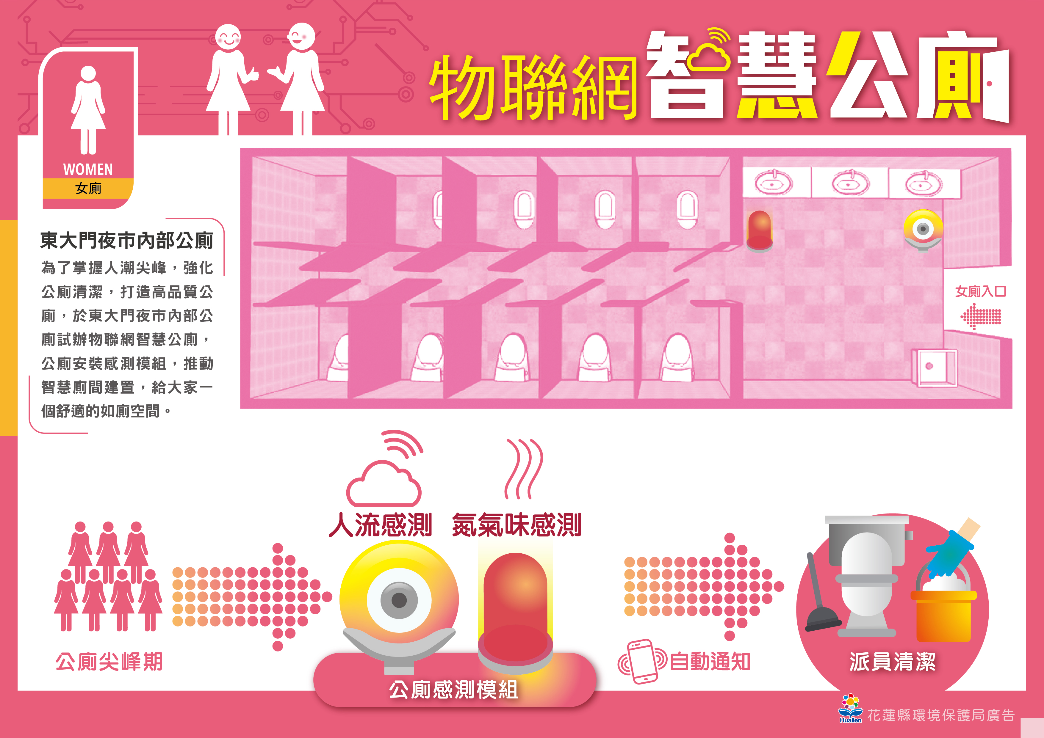 環保局表示,今年以「智慧城市、永續花蓮」為年度施政目標在七星潭、花蓮火車站與東大門夜市三處導入智慧系統,監測公廁「人流數量」、「異味」並回報,尤其在花蓮火車站三樓男廁與多功能廁所更能檢測「剩餘廁紙的百分比」。引入智慧廁間,即是希望透過科技來解決難以處理的公廁問題:「瞬間猛爆性人流使用後的公廁髒亂」,並以此帶給鄉親更乾淨友善的如廁環境。