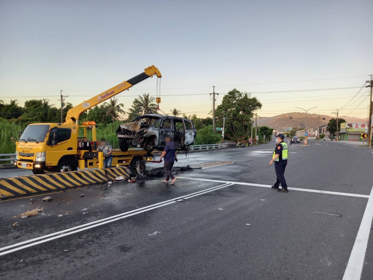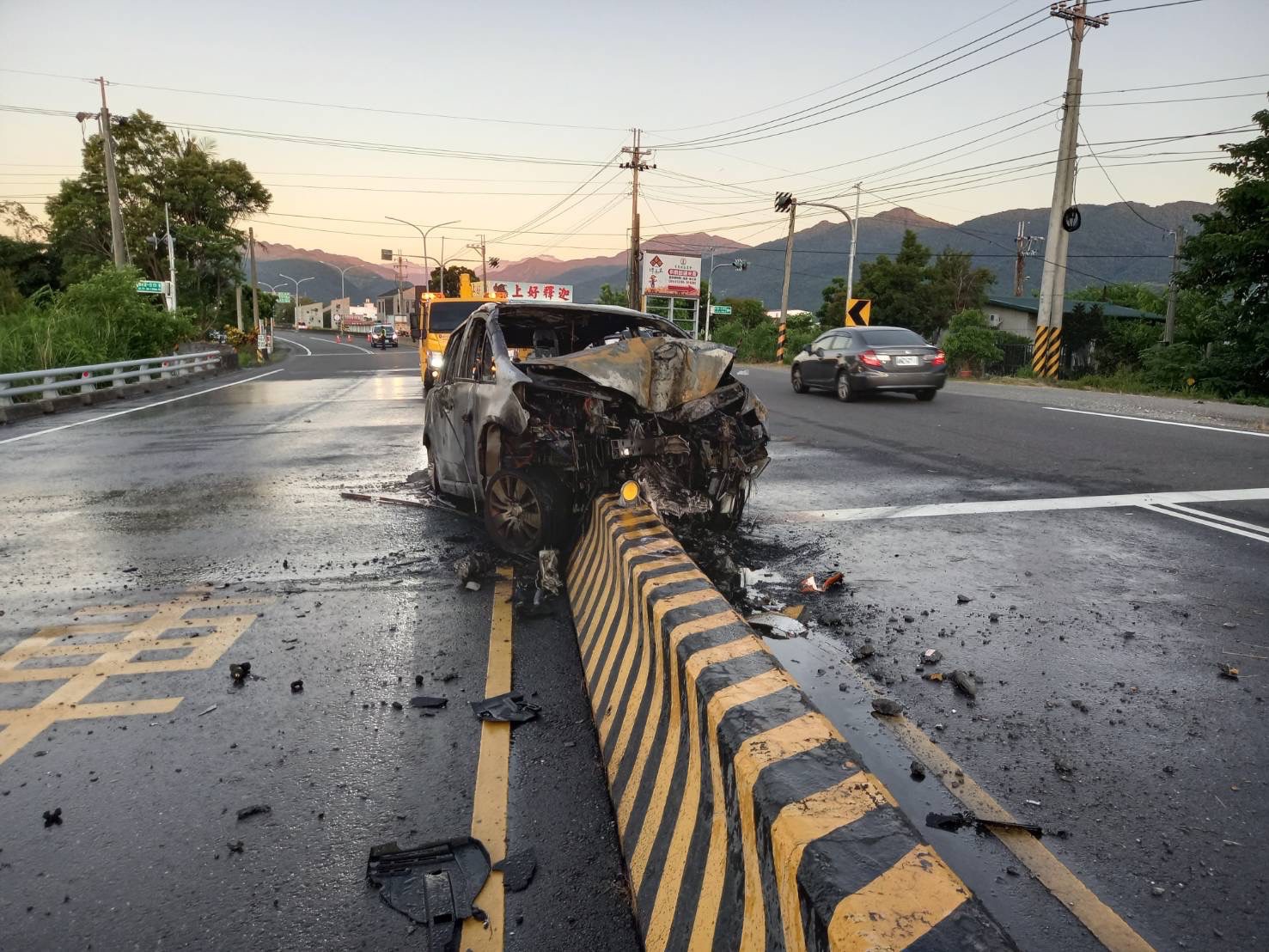 臺東警察分局今(21)日凌晨4時30分許接獲民眾報案,在臺東市知本路一段與知本路一段151巷處發生交通事故,經員警到場了解,該部自小客車沿知本路一段北往南方向行駛,行經知本路一段151巷彎道處,因不明原因撞擊路中護欄,車輛起火燃燒,現場一名陳姓男子(28歲)自行逃出車外,四肢挫傷,意識清楚且無生命危險,經員警實施酒精濃度檢測,陳男酒測值為0.82,雖陳男否認其為該車駕駛,稱駕駛已離開現場,但詳細肇事原因目前警方正追查中。