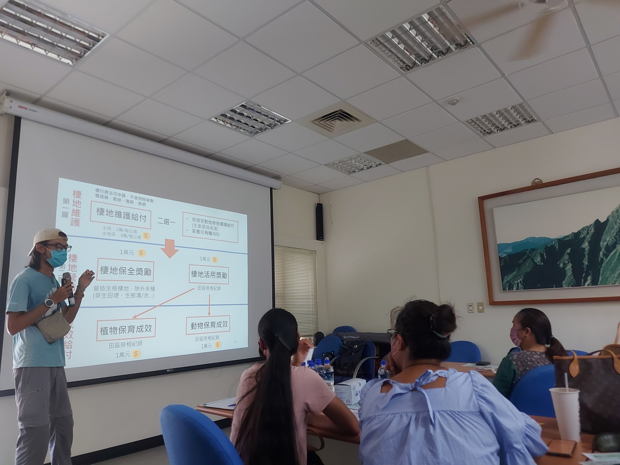 「重要棲地生態服務給付」保育的棲地包含水田及水梯田,單筆農地面積一分地以上即可申請。給付分成棲地維護、棲地營造與棲地成效給付三層,基本的要求條件是田區需終年蓄水、不使用除草劑、毒餌、鳥網,且農產品須符合農藥安全檢出。經查核通過,每公頃水梯田可獲得棲地維護給付三萬元, 水田二萬元。若配合計畫營造更友善生態的棲地環境,依成效每案可再獲得一到四萬元的獎勵給付。花蓮縣農民及農業團體皆可申請。