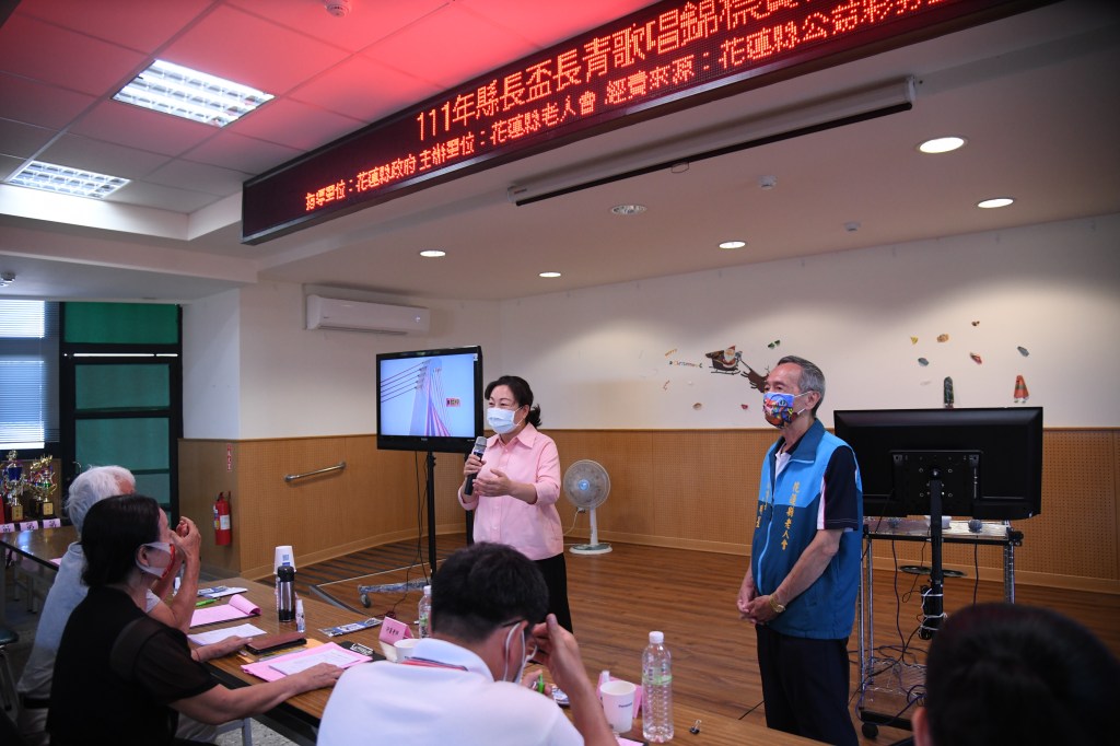 花蓮縣老人會今(21)日辦理111年縣長盃長青歌唱錦標賽活動,由理事長高明星主持,近百位長者齊聚一堂、以歌會友。花蓮縣長徐榛蔚親自出席致意,徐縣長表示,唱歌是有益身心的健康活動,鼓勵長輩們多出來走動,到各社區交流彼此情感,健康呷百二。