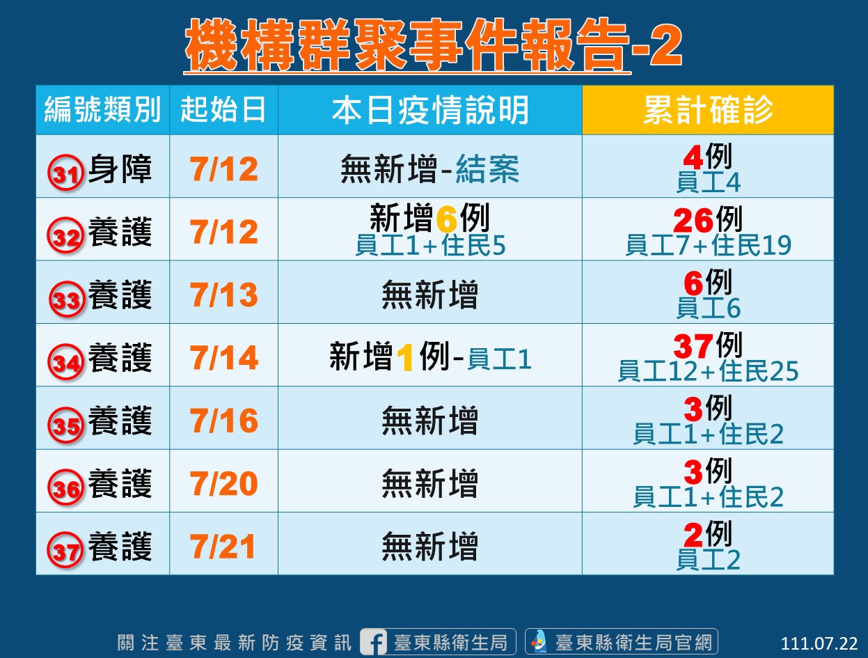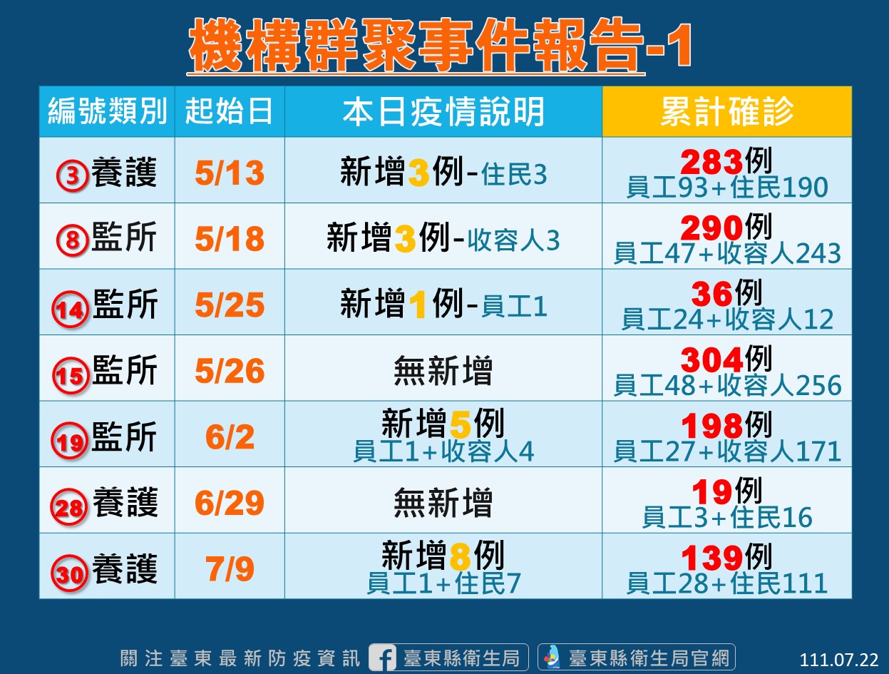 台東縣衛生局表示,今日1身障機構監測期滿結案,總計縣內仍有9養護、4監所群聚事件監控中,今日共新增27例確診個案。養護機構部分,新增18人確診(15住民、3員工);監所新增9人(7收容人、2員工)。群聚監測中之機構仍將暫停探訪探視避免擴大,衛生局將持續安排定期採檢匡列,並協助機構落實感染管制措施。