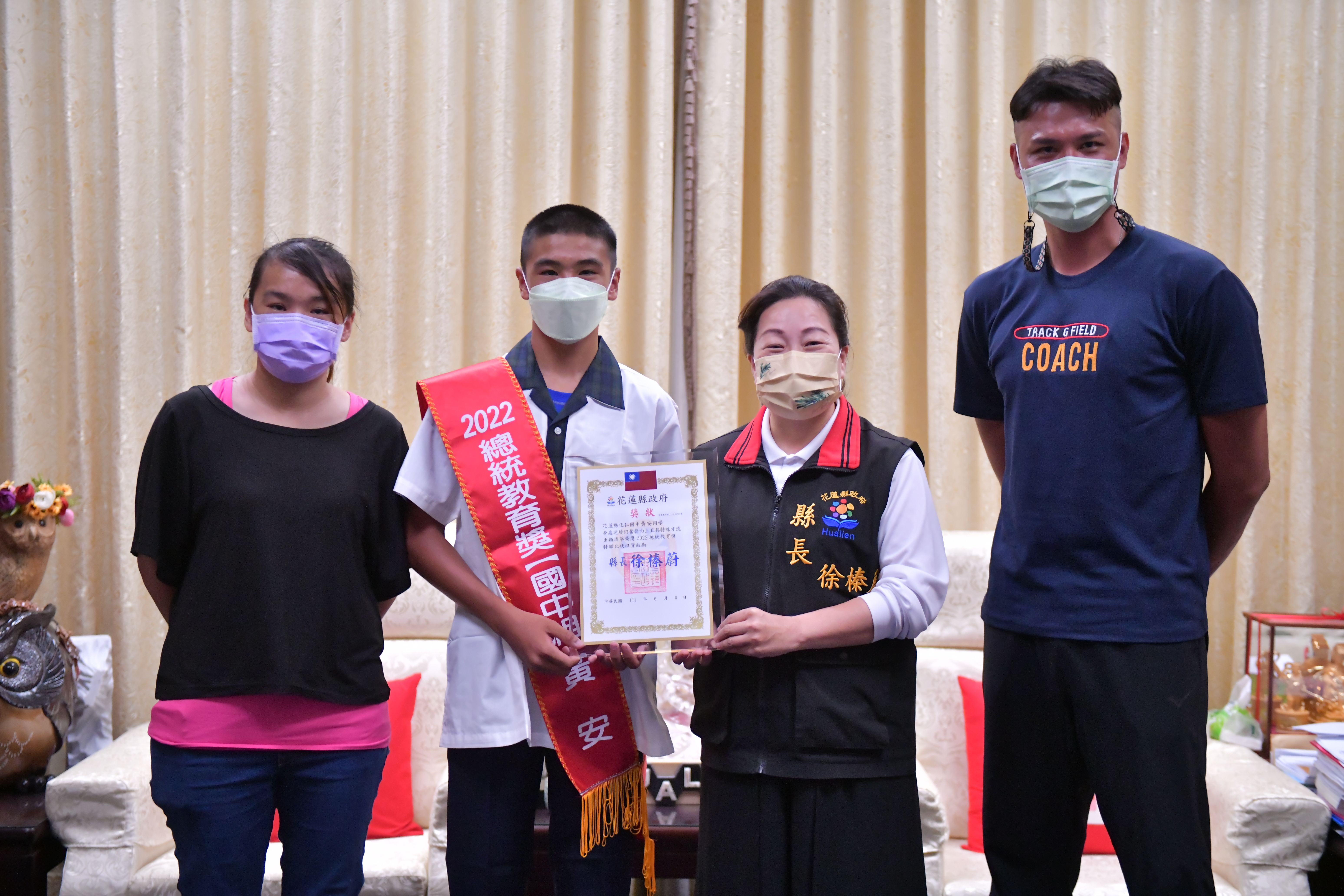 化仁國中黃安同學獲得「2022年總統教育獎」殊榮,今(22)日在校長梁仲志等人的陪同下受縣長徐榛蔚接見,徐縣長感佩黃安克服生理上的限制,樂觀進取的學習精神為同儕榜樣,更勉勵他以順處逆,發揮積極面,並持續奮發向上。