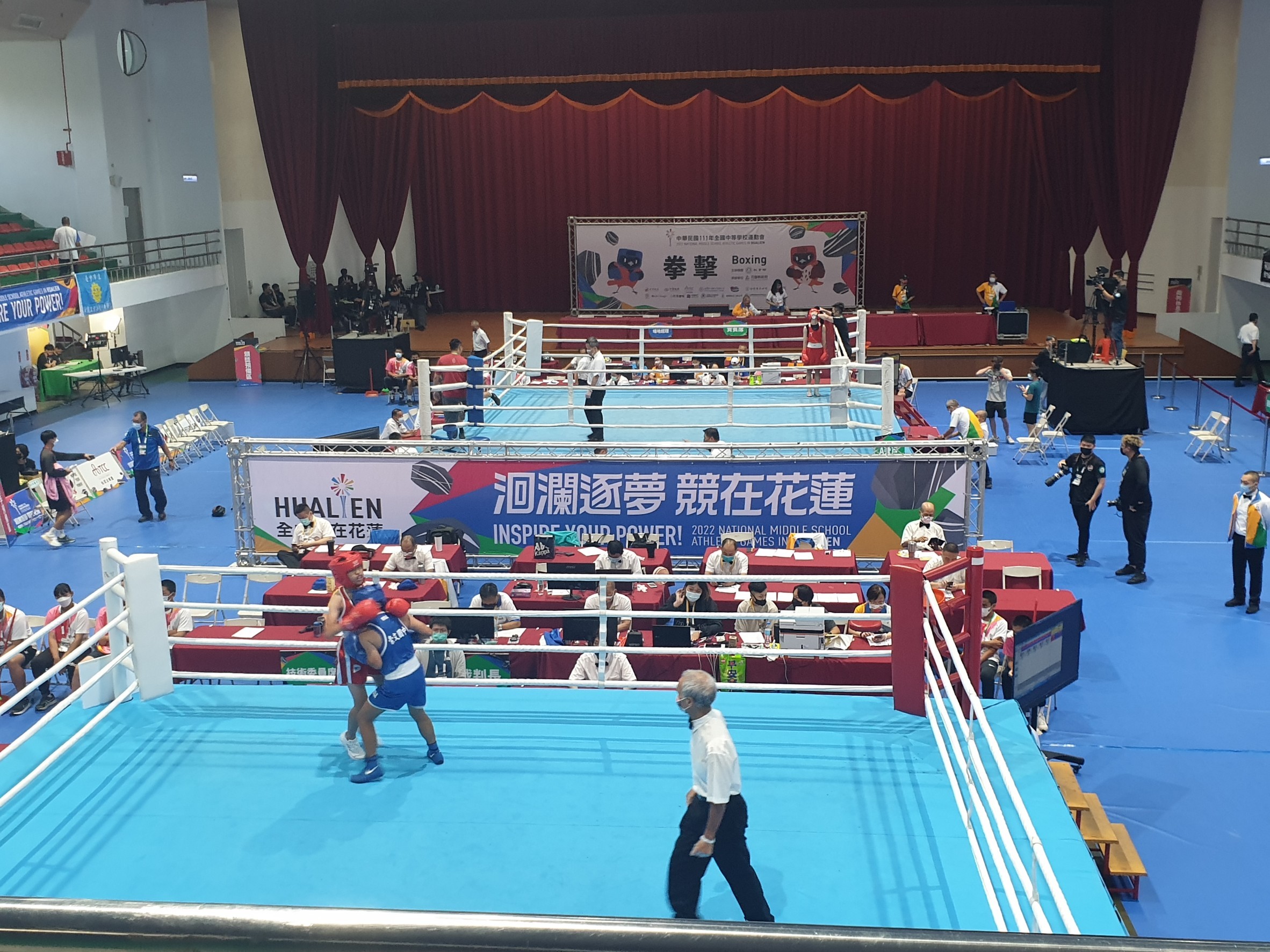 雙拳擊發,戰況激烈,戰場上的勇士們不乏有身經百戰的戰士。拳擊裁判長蔡金順表示,非常感謝花蓮縣政府給予最好的資源,全力來配合拳擊賽事的場地、設備、人力等。蔡金順裁判長也指出,因為疫情的影響,考量安全因素,大會不得已延賽,也因此,關乎拳擊選手的體重必須 “斤斤計較”的結果,若當初報名的量級為第七量級(57.01kg -60.00kg),有可能因青春期正在發育,因三個月來未能控制體重致超過量級範圍而失格不能參賽了,所以體重的控制對於選手們是極大的挑戰。裁判長讚賞大會相當用心,尤其是場地經理孫東志校長,對裁判、教練的要求都極力做到最好,比賽如期進行,「好的開始,是成功的一半。」相信未來五天的拳擊賽事將會順利圓滿。