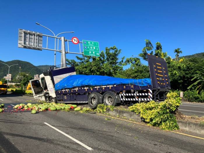 臺東市青海路載貨大貨車為閃躲動物自撞分隔島 西瓜散落一地