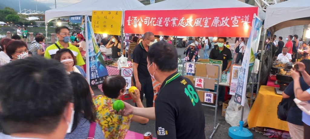 臺酒公司花蓮營業處(花蓮酒廠)於7月23日太平洋左岸最盛大最指標性的原住民族文化特色大型活動「2022花蓮縣原住民族聯合豐年節」辦理產品銷售品評推廣活動,並利用推廣品評邀請鄉親一起參與「全面反貪賦能教育宣導」九宮格投擲軟球遊戲,於九宮格格子分別設置「貪汙」、「瀆職」、「賄選」等不法字樣,參與活動民眾,持軟球,對九宮格投擲,擊中貪汙,象徵打擊貪汙之決心。參與活動民眾,可得贈品0.5公升氣泡水1瓶。