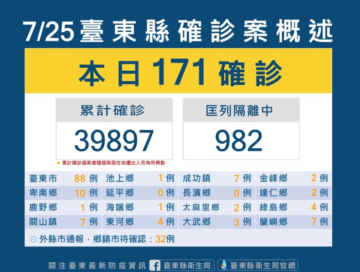 城鄉新聞 記者 姜嘉瑋/臺東報導 台東縣今(25)日新增171位確診者,139名民眾戶籍或居住地分在台東、32 … 繼續閱讀 台東縣衛生局呼籲需隔離民眾應落實執行3+4 出現發燒、皮膚病灶疑似症狀立即通報衛生局