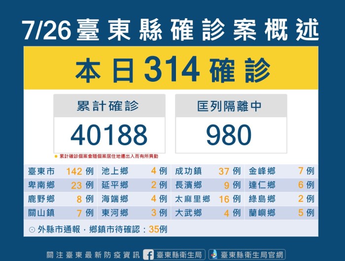 城鄉新聞 記者 姜嘉瑋/臺東報導 台東縣今(26)日新增314位確診者,279名民眾戶籍或居住地分在台東、35 … 繼續閱讀 台東今新增314位確診案 衛生局籲6個月以上幼童 應儘早接種 避免造成重症及MIS-C