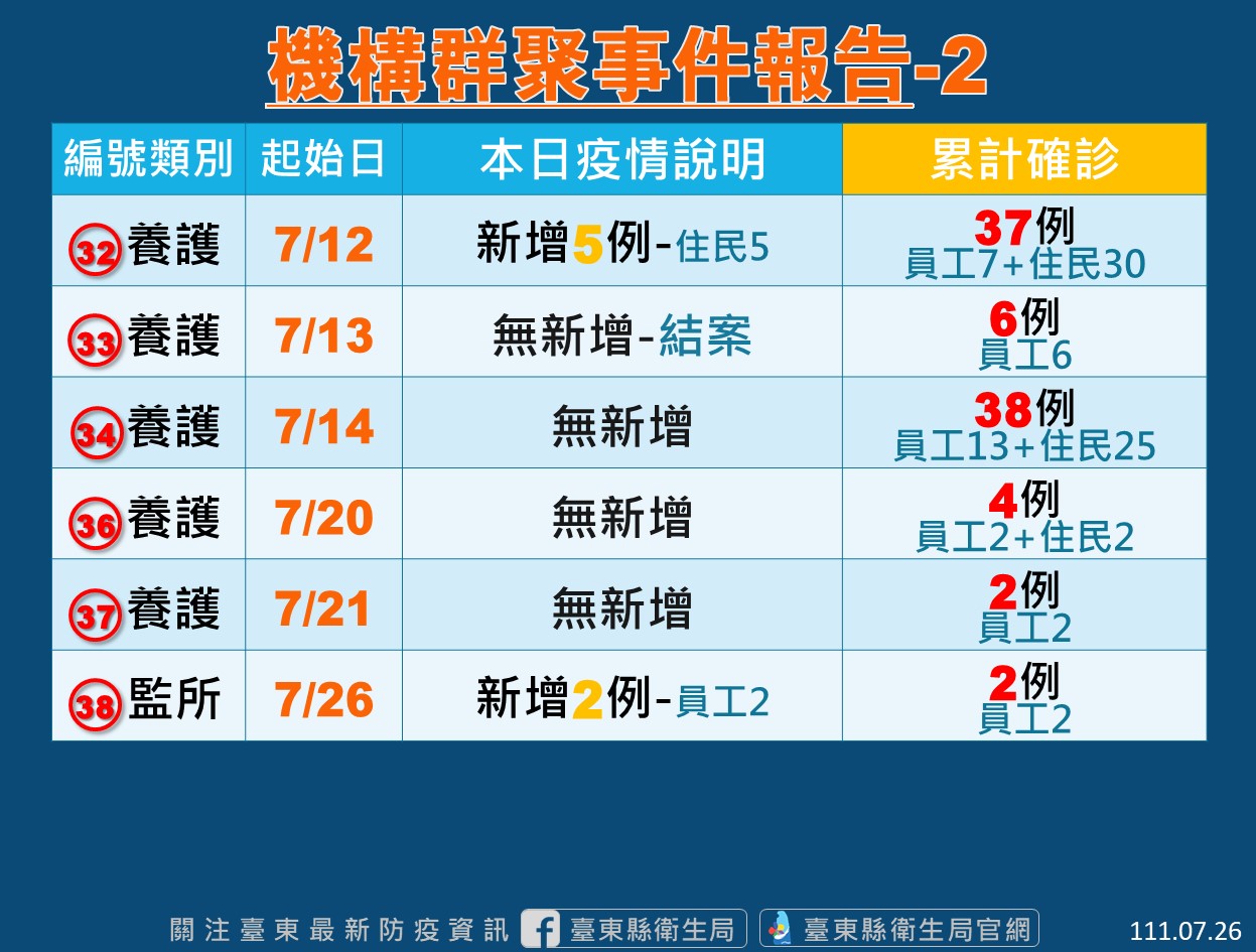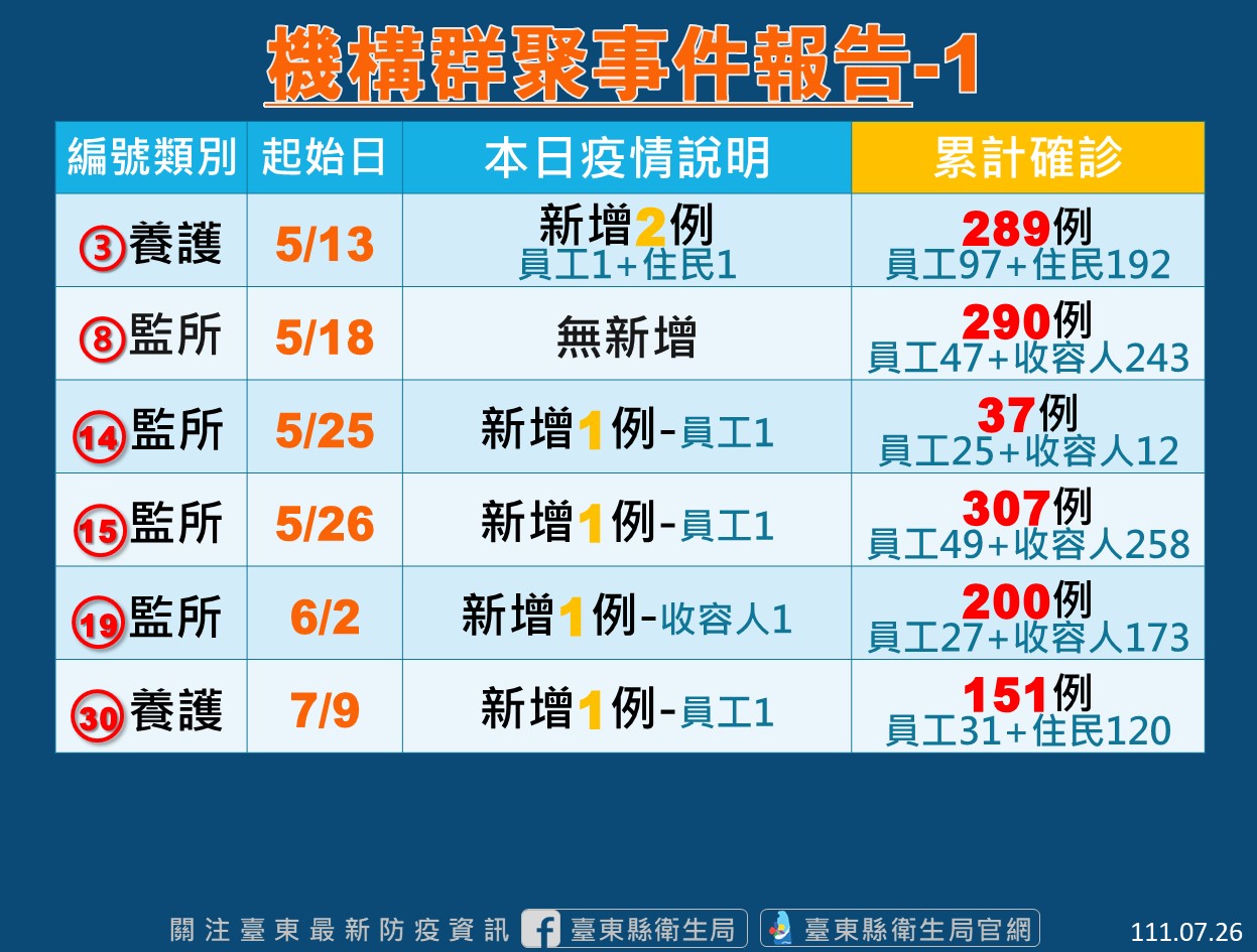 台東縣衛生局表示,今日1養護機構監測期滿結案,但1矯正機關因員工確診重啟群聚事件調查,總計縣內仍有6養護、5監所群聚事件監控中,本日共新增13例確診個案。養護機構部分,新增8人確診(6住民、2員工);監所新增5人(1收容人、4員工)。群聚監測中之機構仍將暫停探訪探視避免擴大,衛生局將持續安排定期採檢匡列,並協助機構落實感染管制措施。