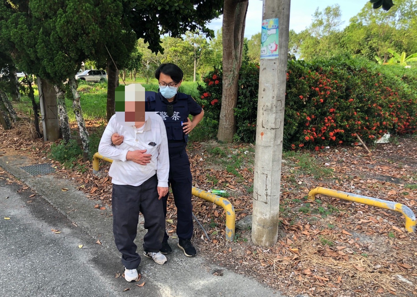 北埔派出所員警獲報後,立即加強巡視,警員魏恆御、陳禮揚於5時許,行經安樂街3巷口,看見一名老人倒臥路旁,員警立即下車上前關心他的身體狀況,老人當下意識清楚,表示身體無異狀,員警詢問其身分欲協助老先生返家,但他不記得自己的身分資料,員警見其身著衣褲及鞋子顏色,立即聯想上午王姓民眾所報失蹤的父親,立即先將他帶返所休息,經確認身分後,老先生就是失蹤的王姓男子,警方接著通知其子前來派出所,王姓民眾到所後看到父親平安無事非常感動,很感謝警方的協助。