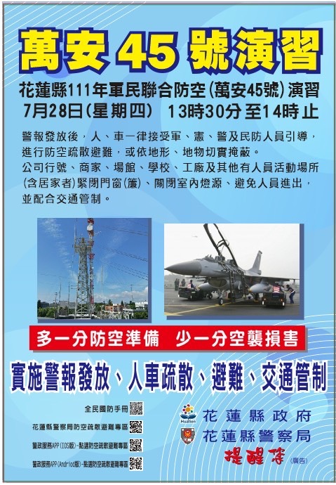 萬安45號演習,花蓮縣於111年7月28日下午1時30分至2時止,全面實施人、車管制30分鐘,提醒民眾儘早調整行程,避免在炎熱的正中午花費時間等候。 花蓮縣警察局為求充分宣導整備,製作五部國、台、客、阿美族、太魯閣族語言影片,宣導演習注意事項及請求鄉親配合演練,提 升花蓮鄉親對防空避難的警覺心並熟練緊急疏散避難作為,強化全縣軍民聯合防空整備效能,確保人民生命財產安全。 花蓮縣警察局將花蓮縣防空疏散避難設施地點470處(花蓮分局152處、吉安分局175處、新城分局54處、鳳林分局40處、玉里分局49處、可容納37萬3,316人)及地圖置於該局網頁,並製作QRCODE以利連結;另該局臉書粉絲專頁亦可下載QRCODE,或自內政部警政署「警政APP-防空疏散避難專區」 下載查詢快速定位最近的疏散避難處所,防空疏散避難處所均有張貼標誌牌。也可以上網google下載「全民國防手冊」,瞭解戰爭來臨時該怎麼處置應變。 花蓮縣警察局局長戴崇贒呼籲,28日演習時段請民眾配合以下事項: