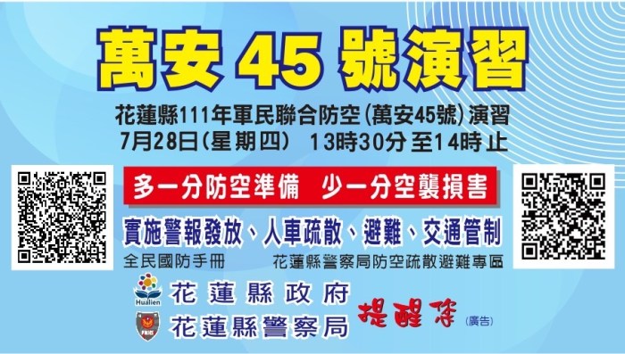 城鄉新聞 記者 姜嘉瑋/花蓮報導 萬安45號演習,花蓮縣於111年7月28日下午1時30分至2時止,全面實施人 … 繼續閱讀 萬安演習28日13:30起進行人車管制30分鐘請做好應變