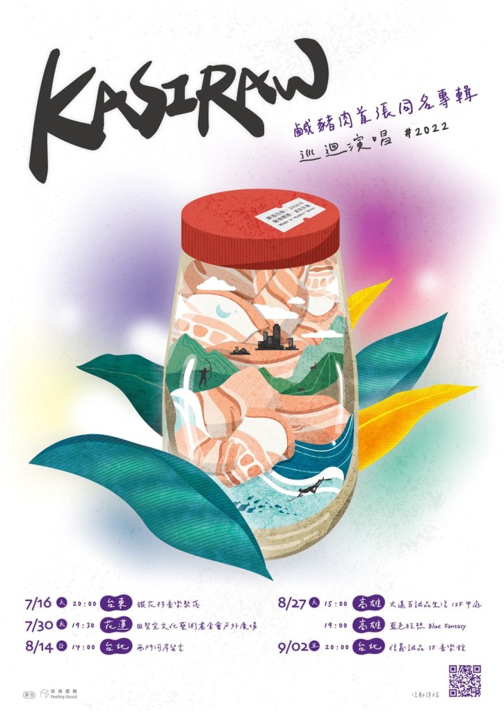 這22年中,我們共同扛著來自花蓮「KASIRAW鹹豬肉樂團」的招牌,巡迴世界各地、大江南北。到過歐洲、美洲、澳洲、中國、韓國……等國,我們拿過「台北世大運主題曲」季軍、「臺灣原創流行音樂大賽」原民組貳獎、新北市原Band大賞」首獎、也拿下現在一直還沒下莊的「新北市貢寮海洋音樂祭」海洋獨立音樂大賞。算了算8000多個日子過去,常常有朋友、粉絲、部落族人提起「我們的專輯到~底在哪裡買?」過去很長的時間裡,我一直無暇面對這個問題。