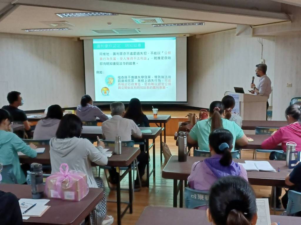 臺東縣衛生局為協助同仁瞭解廉政法令規範及從事公務應有行為準則,日前由政風室規劃於衛生局5樓大禮堂舉辦「111年專案法紀宣導講習」,邀法務部廉政署駐署檢察官蔡佰達授課,希望建立員工廉能觀念與法治素養,未來在執行職務時能依法遵循。