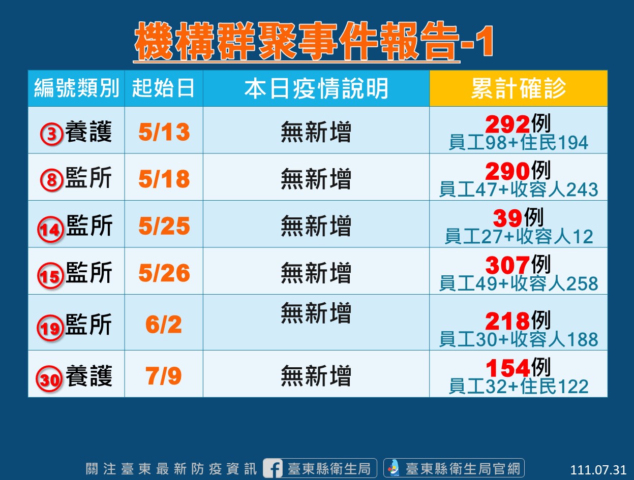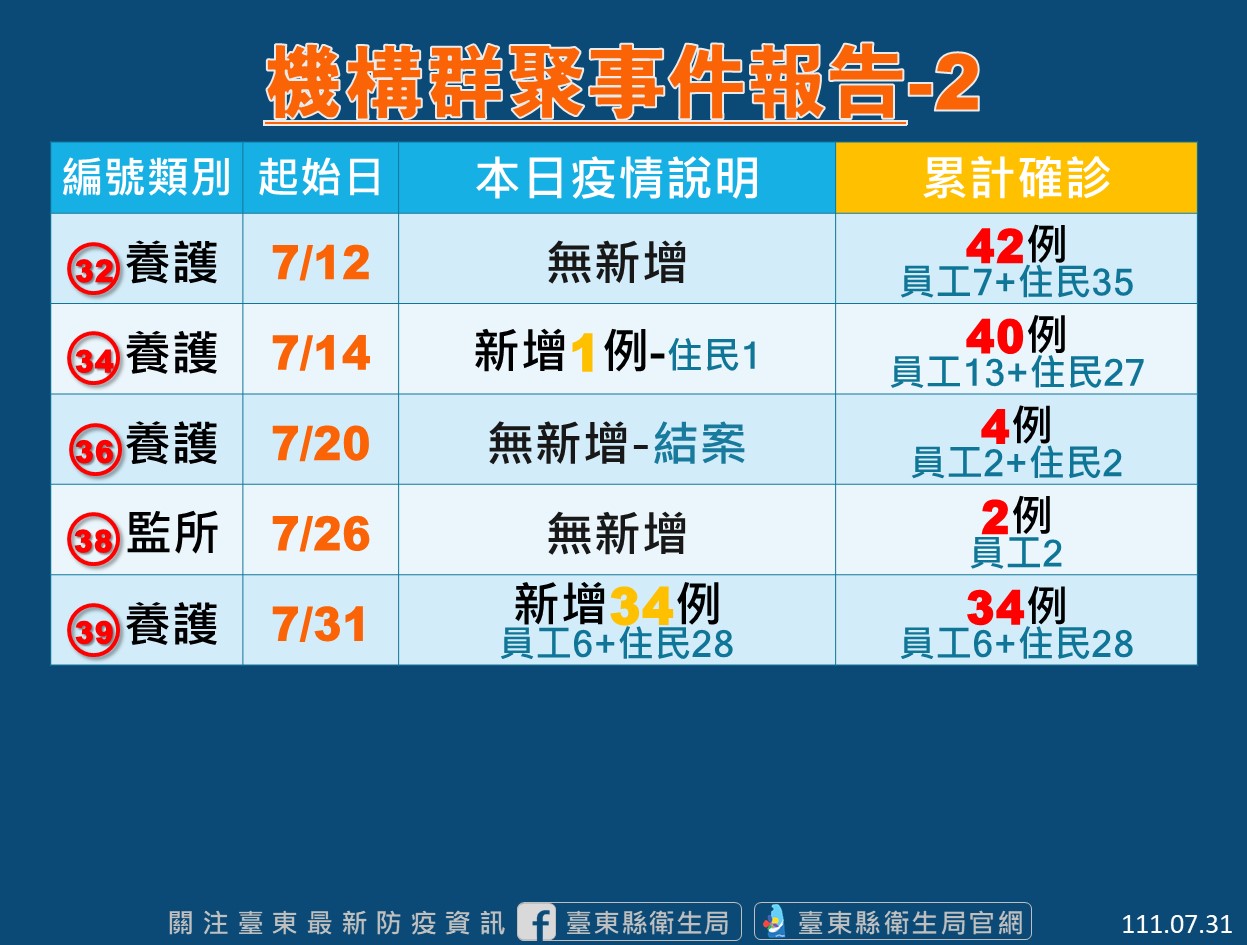 台東縣衛生局表示,縣內1養護機構今日監測期滿結案,但再新增1養護機構確診群聚事件,總計縣內仍有5養護、5監所群聚事件監控中,今日共新增35例確診個案,皆為養護機構人員(29住民、6員工)。群聚監測中之機構仍將暫停探訪探視避免擴大,衛生局將持續安排定期採檢匡列,並協助機構落實感染管制措施。