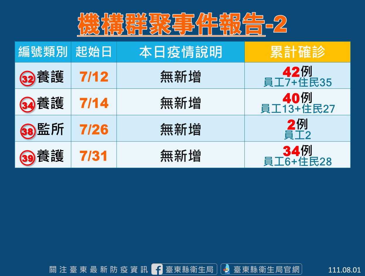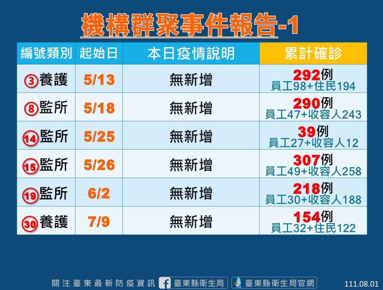 台東縣衛生局表示,縣內目前共有5養護、5監所群聚事件監控中,今日無新增確診病例。衛生局將持續安排定期採檢匡列,並協助機構落實感染管制措施。