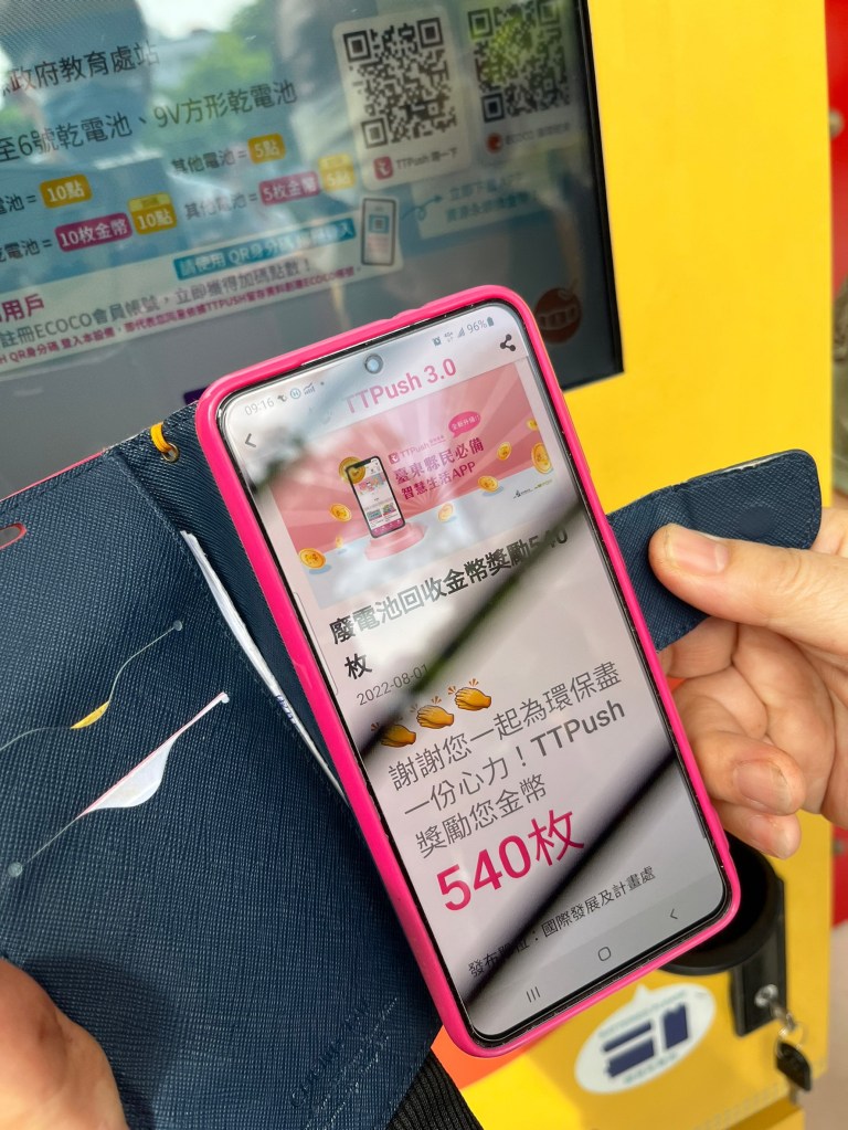 臺東縣政APP TTPush積極落實聯合國永續發展目標(SDGs),為協助解決廢電池未妥善處理造成的環境影響並增加大眾回收意願,特別攜手智慧回收業者「ECOCO 宜可可循環經濟」,於今(1)日正式啟用臺東首座TT-Push X ECOCO「智慧電池回收機」,將數位科技與友善環境結合的回收行動變得更便利、有趣,民眾只要於ECOCO「智慧電池回收機」投入指定型號的舊電池,就能獲得臺東金幣,金幣可以到在地特約商家折抵消費,還可加碼獲得ECOCO點數,打造生活顧環保與經濟的雙贏局面。