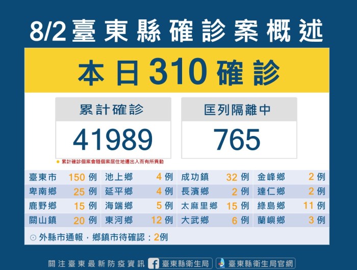 城鄉新聞 記者 姜嘉瑋/臺東報導 台東縣今(2)日新增310位確診者,308名民眾戶籍或居住地分在台東、2名為 … 繼續閱讀 台東縣今增310例 饒慶鈴呼籲儘速接種疫苗 落實防疫相關措施