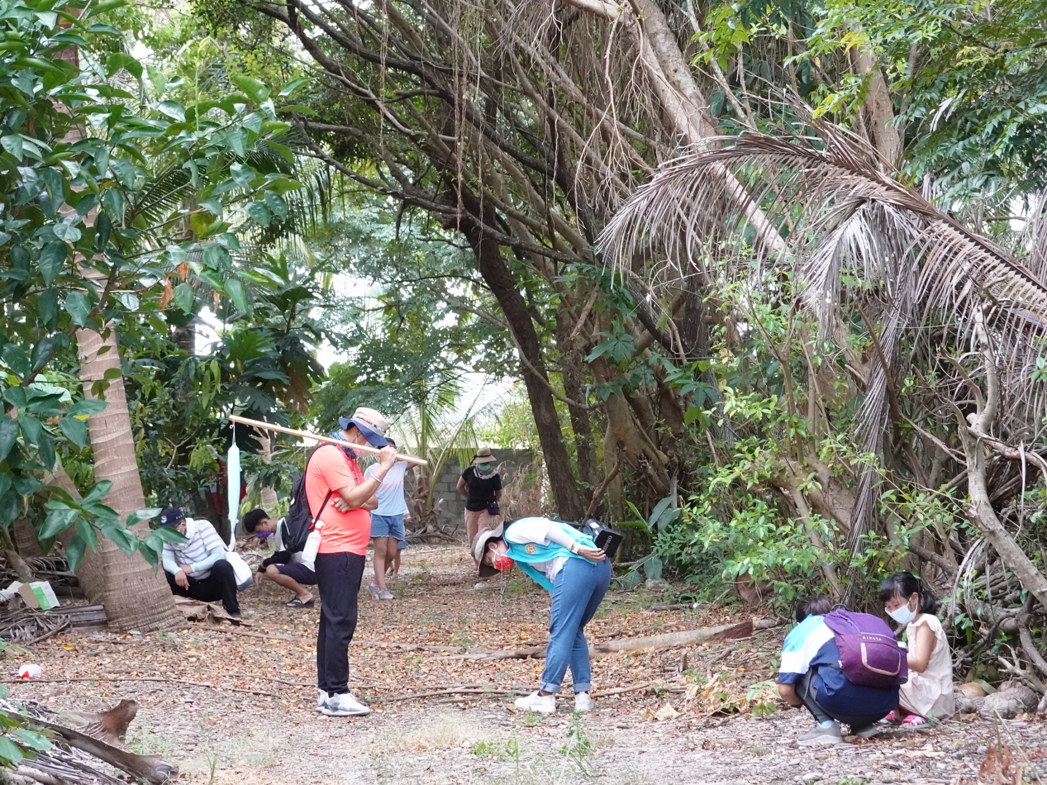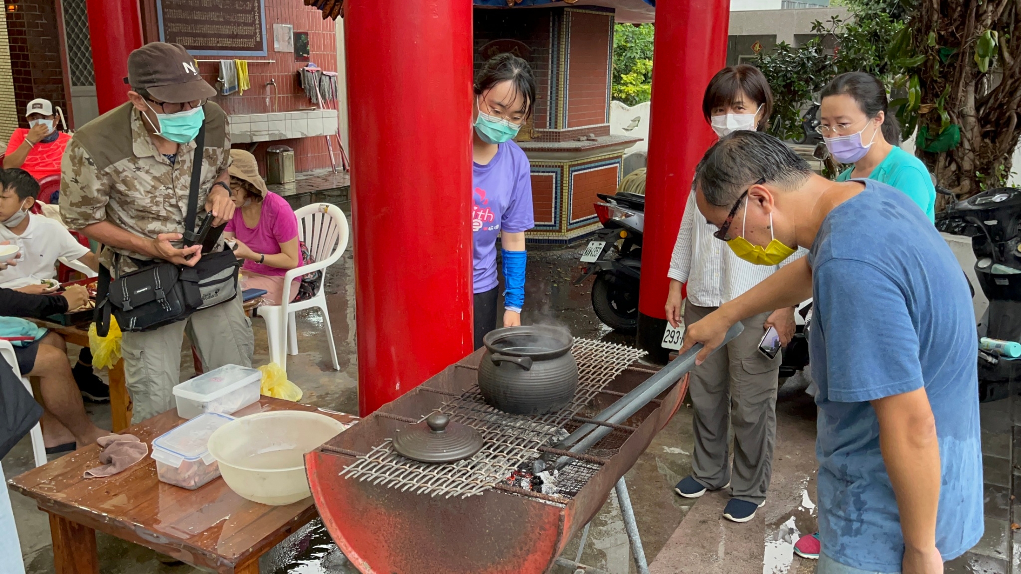 溫館長拿著有刻鑿痕跡的石頭說,網墜是臺灣考古遺址常發現的文物,通常是搭配漁網使用的漁撈工具,將多個網墜繫在漁網週端處,於撒網時可以加速下沉,有固定漁網形狀的功用,這些石網墜是原始人類結網捕魚不可缺少的工具。學員輪流拿著3千年前遺留下來的石頭,也感到不可思議。緊接著由孩好書屋負責人賴威任,帶領參加學員想像三千年前的人類,是如何使用海鮮料理。賴威任說,因現階段考古提供的訊息有限,只能嘗試用從文獻中來復刻,依據挖掘出網墜可以推論,當時已有在捕魚,當時可能的料理方式是火烤及石煮法,他也讓學員們一起動手烤蝦,並體驗原始人的石頭火鍋料理,將石頭燃燒後丟入水中加熱。