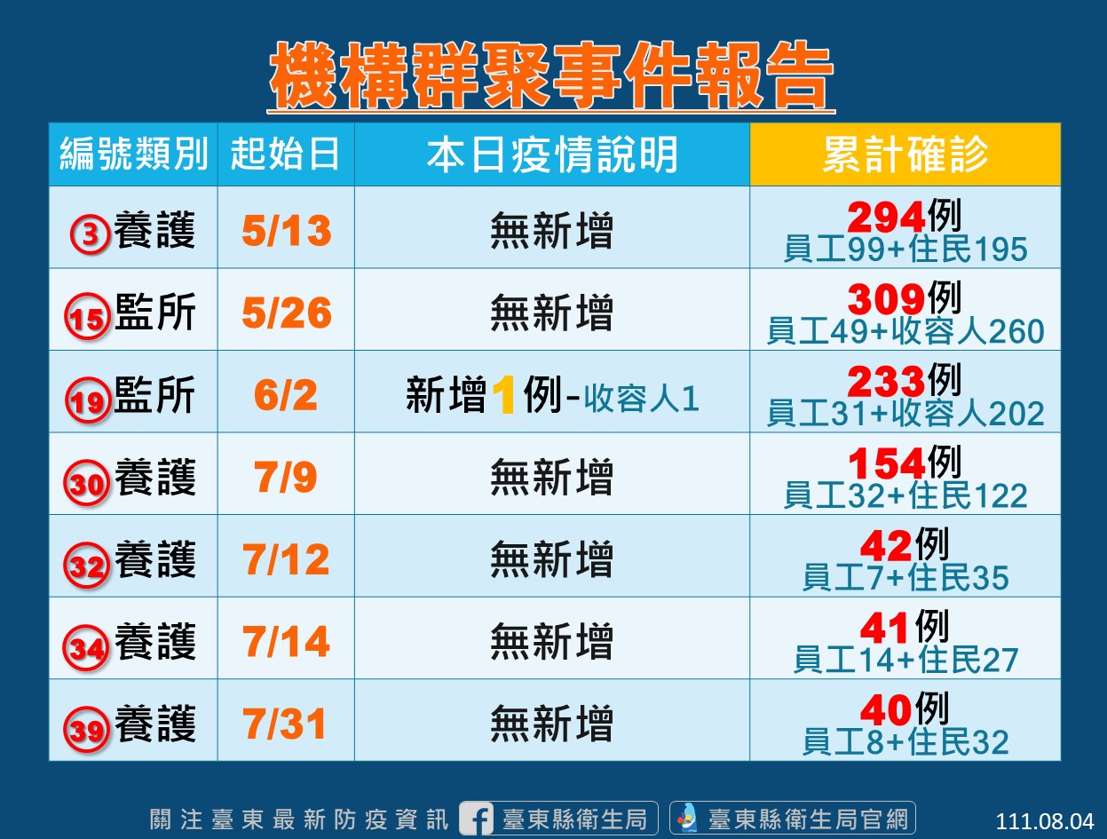 台東縣衛生局表示,縣內目前共有5養護、2監所群聚事件監控中,今日新增1確診病例,為監所住民。衛生局將持續安排定期採檢匡列,並協助機構落實感染管制措施。
