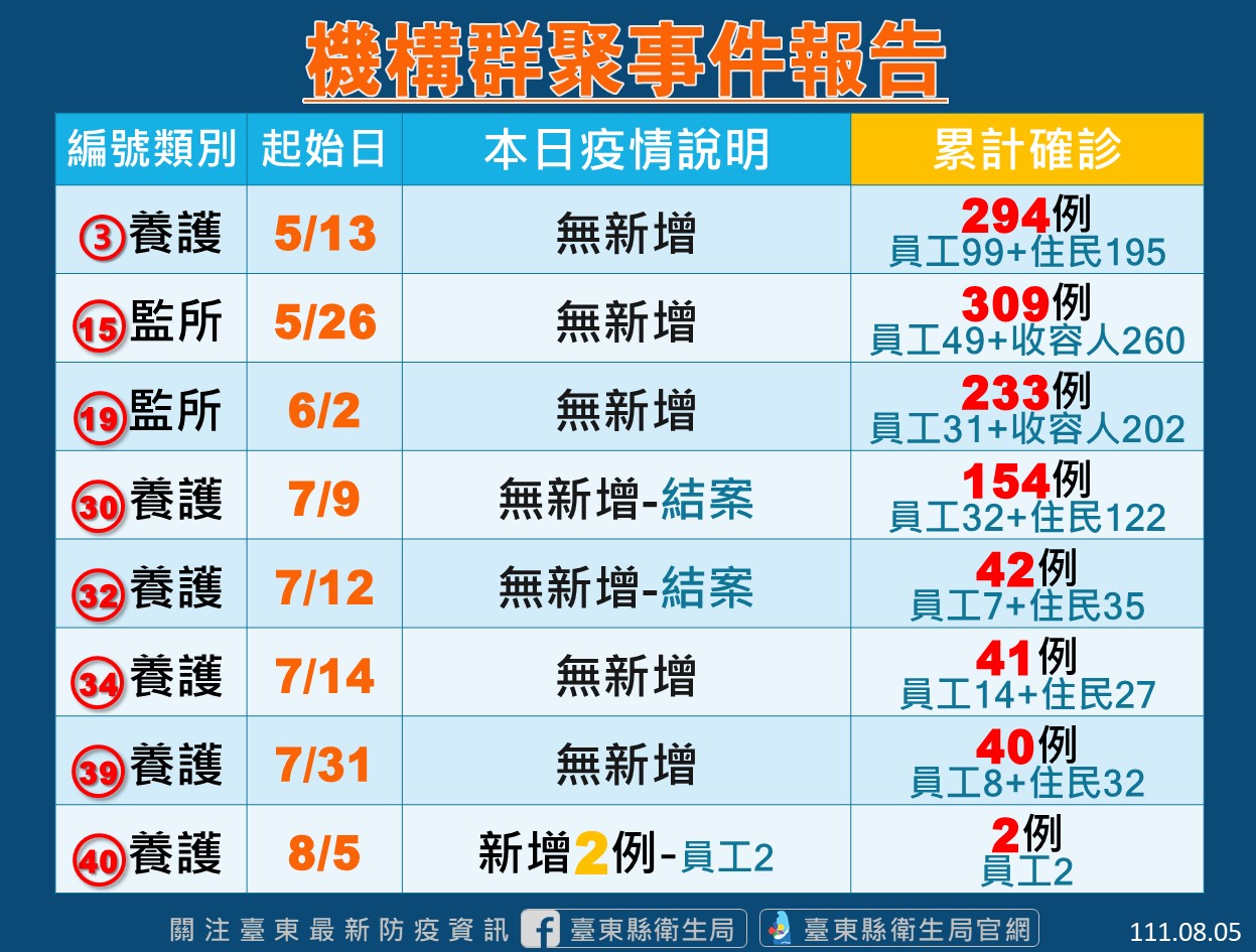 台東縣衛生局表示,縣內2養護機構今日監測期滿結案,但新增1養護機構群聚事件調查,總計縣內尚有4養護、2監所群聚事件監控中,今日共新增2例確診個案,皆為養護機構員工;監所無新增。群聚監測中之機構仍將暫停探訪探視避免擴大,衛生局將持續安排定期採檢匡列,並協助機構落實感染管制措施。