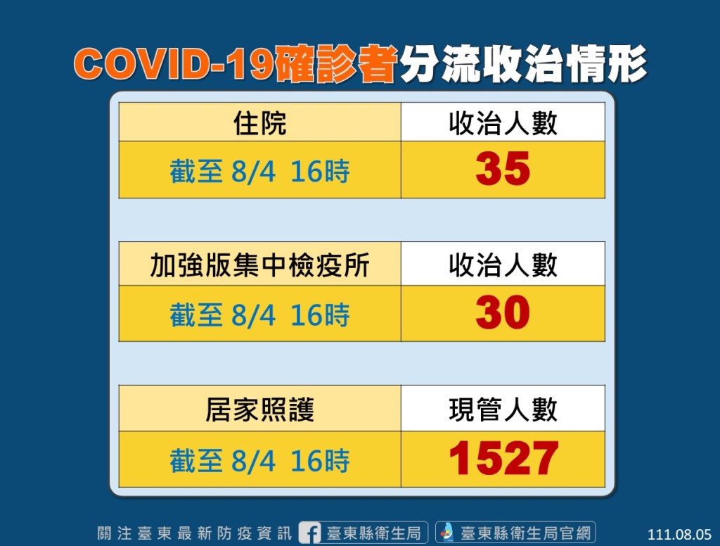 台東縣今(5)日新增227位確診者,208名民眾戶籍或居住地分在台東、19名為外縣市醫院通報。目前台東縣累計確診個案42707人、居隔者924人。另外,台東縣針對COVID-19確診者分流收治情況,截至8/4下午16點為止,住院收治人數為35、加強版集中檢疫所為30人、居家照護現管人數有1527人。