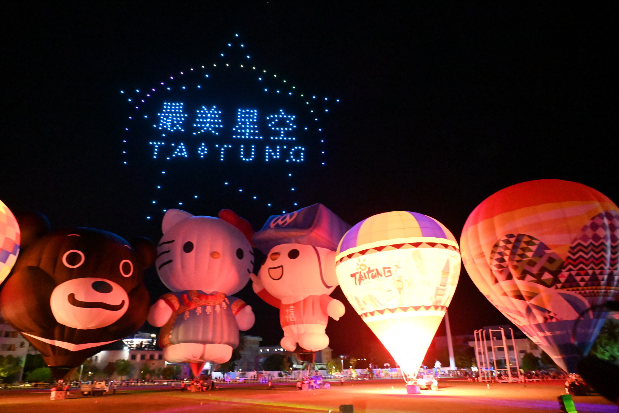 隨著音樂響起,300架無人機群從熱氣球後方逐漸登場,在夜空排列出各種閃亮圖樣。先以「Hello Taitung」作為開始,接著陸續呈現出「Hello Kitty」、「金樽衝浪」、「最美星空」、「乘風而騎」、「知本暖湯」、「成功曙光」、「舊站百年」等代表臺東意象的圖案,並以臺東品牌「真、善、美」絢爛奪目收尾,現場觀眾滿滿感動,驚呼「台東真美!」