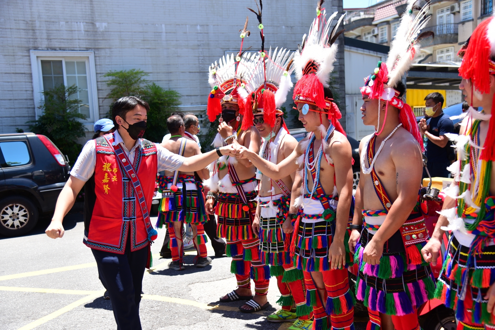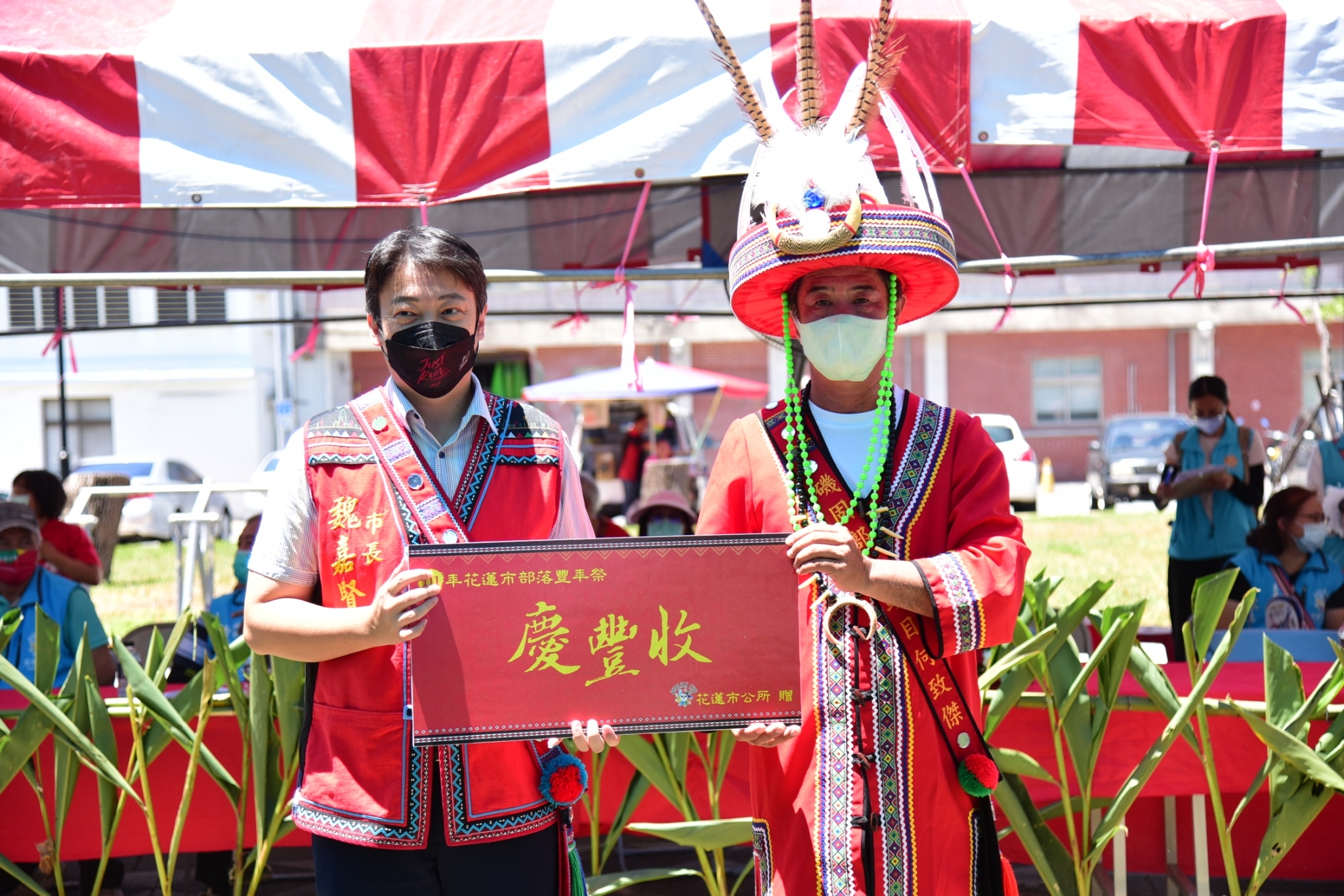 魏嘉賢市長偕同原行課長姜靜嫻前往致贈慶豐收補助金,他說,花蓮市屬於都會區的型態,部落族人除了傳承文化之外,也期盼能將族語向下紮根。魏嘉賢表示,豐年祭是文化傳承的大日子,看到現場有不少年輕人回鄉承接部落文化的美好,真心祈求祖靈保佑花蓮市每一個人平安。