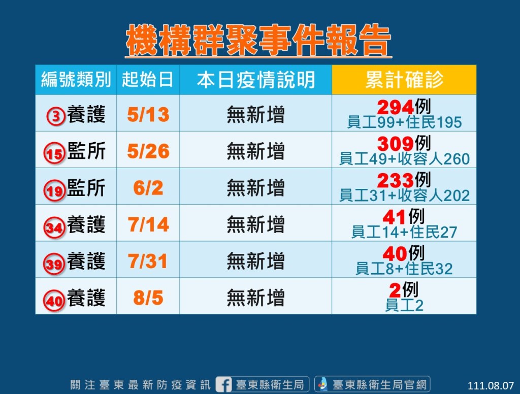 台東縣衛生局表示,縣內目前共有4養護、2監所群聚事件監控中,今日無新增個案。衛生局將持續安排定期採檢匡列,並協助機構落實感染管制措施。