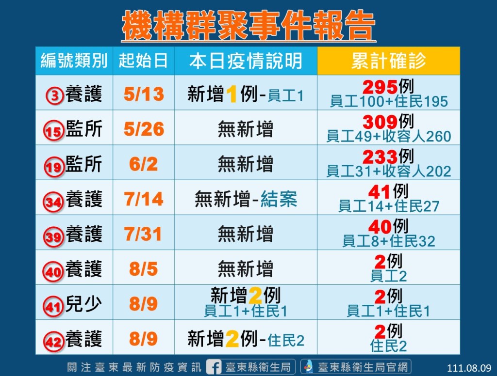 台東縣衛生局表示,縣內1養護機構今日監測期滿結案,另新增1養護機構與1兒少安置機構群聚案,總計縣內尚有4養護、2監所、1兒少機構群聚事件監控中。養護機構部分,新增3人確診(2住民、1員工);兒少安置機構新增2人(1住民、1員工),監所無新增。群聚監測中之機構除暫停收新住民外,亦將暫停探訪探視避免擴大,衛生局將持續安排定期採檢匡列,並協助機構落實感染管制措施。