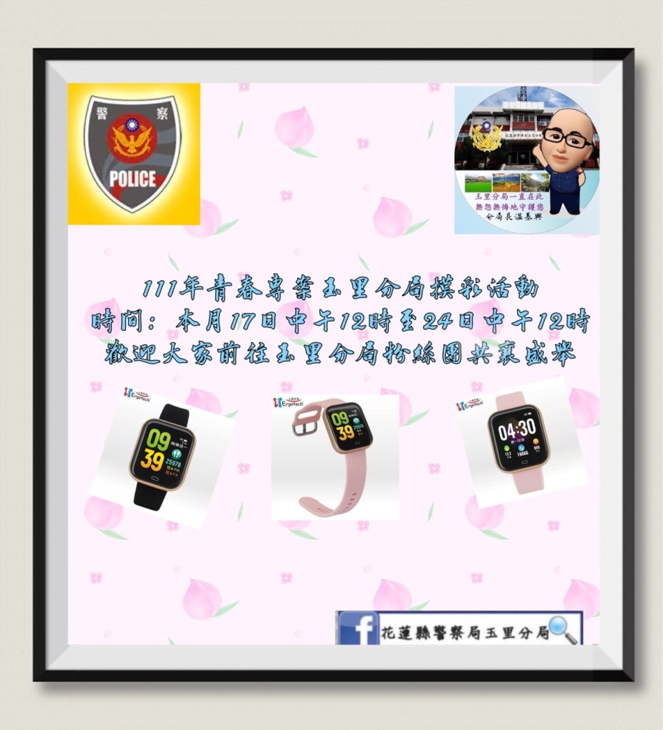 玉里分局表示,暑假期間隨著學子宅在家中時間增加,接觸網路時間亦隨之大增,為淨化妨害青少年成長環境,鼓勵民眾多從事戶外運動,研究顯示運動能增加自身的免疫力及分泌多巴胺,能讓心情愉悅;玉里分局特別選定智慧運動手錶當作獎品,以臉書粉絲專頁方式,辦理網路互動防制青少年避免觸法宣導有獎徵答,歡迎大家踴躍宣傳,邀請親朋好友共襄盛舉。