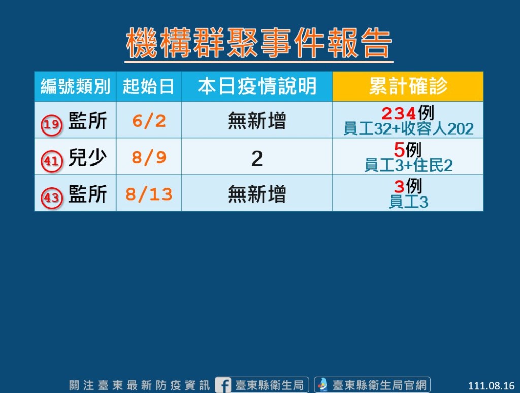 台東縣衛生局表示,縣內1養護機構今日監測期滿結案,總計縣內尚有2監所、1兒少機構群聚事件監控中,今日新增2兒少安置機構員工確診。群聚監測中之機構除暫停收新住民外,亦將暫停探訪探視避免擴大,衛生局將持續安排定期採檢匡列,並協助機構落實感染管制措施。