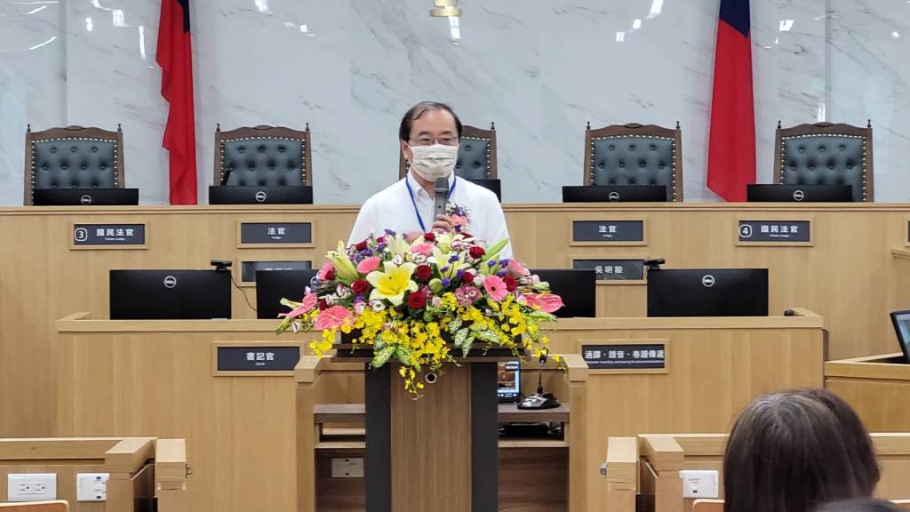 周占春副秘書長致詞表示國民法官新制度與現行刑事訴訟制度多有不同,例如卷證不併送等規定,是刑事審判制度從精緻審判走向核心審判的歷程,對職業法官及擔任國民法官的民眾都是一大挑戰,期許全國各地方法院在國民法官法庭完善的建置下,讓民眾順利走入法庭,與職業法官合審合判。花蓮高分院陳真真院長對花蓮地方法院國民法官法庭專區規劃表示讚賞,未來國民法官一定可以在優美的環境下安心審判;法扶花蓮分會林國泰會長致詞表示法律扶助是國民法官制度重要的協力單位,未來將加強律師對國民法官新制之瞭解,促進正義的實現。