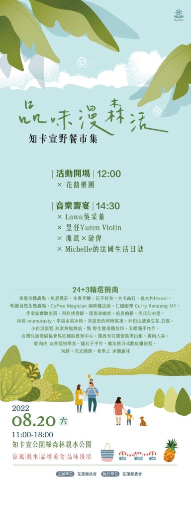 為了讓縣民有多元的休閒活動場域,花蓮縣政府在知卡宣綠森林親水公園爭取到重塑改造計畫,打造親子共遊的安全遊樂空間。在縣長徐榛蔚重視食農與環境教育的方針下,知卡宣公園今年重啟暑期限定的戲水活動,更邀請農村社區夥伴,在七八月的週末一同在園區內進行綠色療癒手作,在暑期的尾聲,花蓮縣政府結合在地農會和青農,將於8/20辦理「品味漫森活」野餐市集,邀請大家一起吃美食、看表演,享受在綠地上野餐的樂趣。